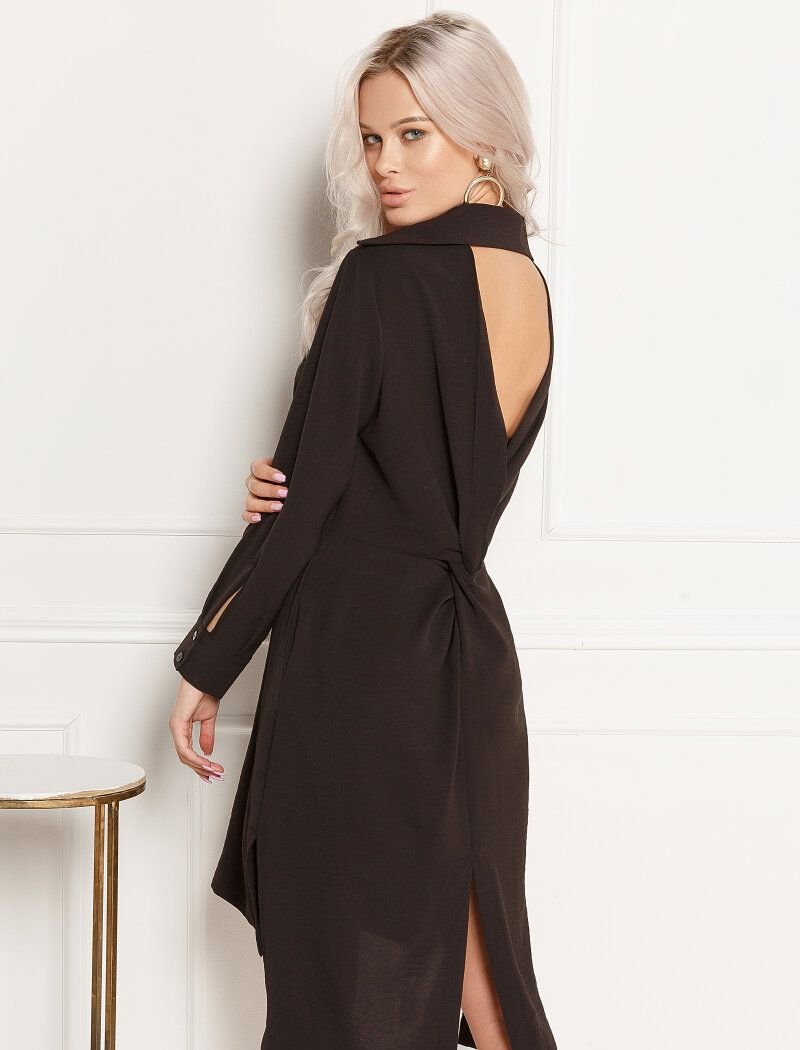 A fitted dress made of flowing fabric. Classic turn-down collar, long sleeve. A beveled placket with buttons on the front, an open back, pockets in the seams, two slits on the sides and one on the back.