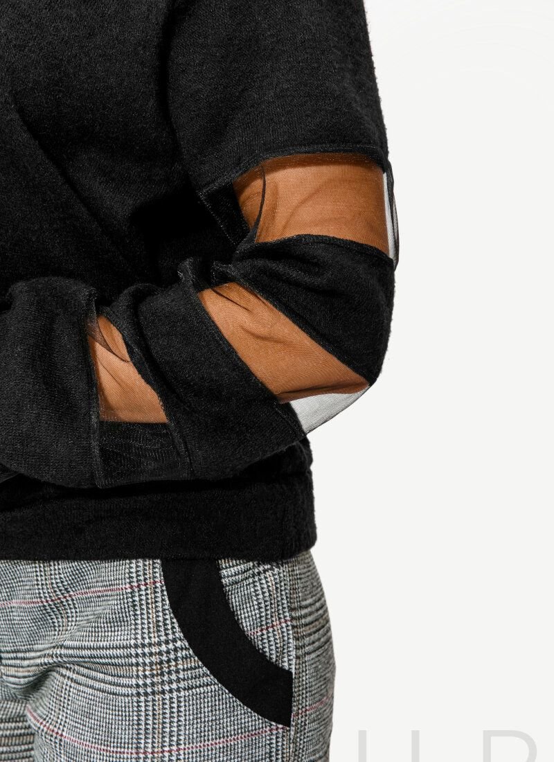 A loose-fitting knitted jumper with a round neck, long sleeves with mesh inserts and an elastic cuff. .