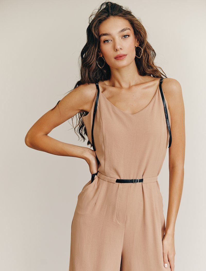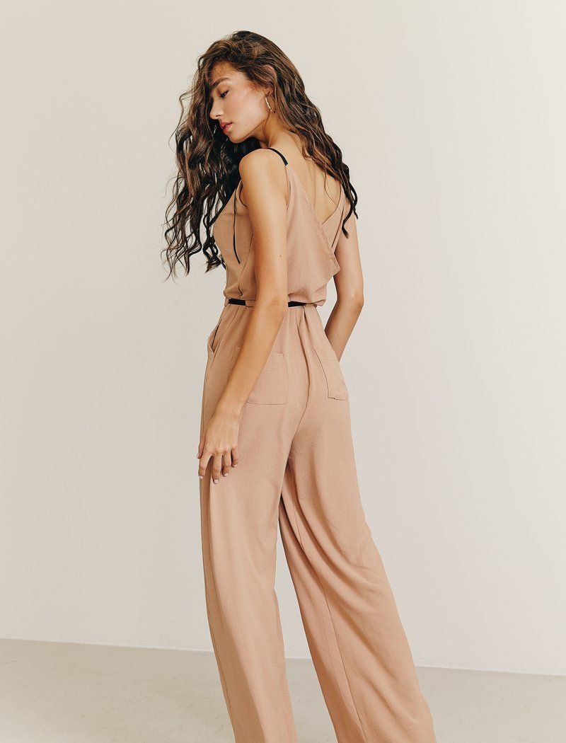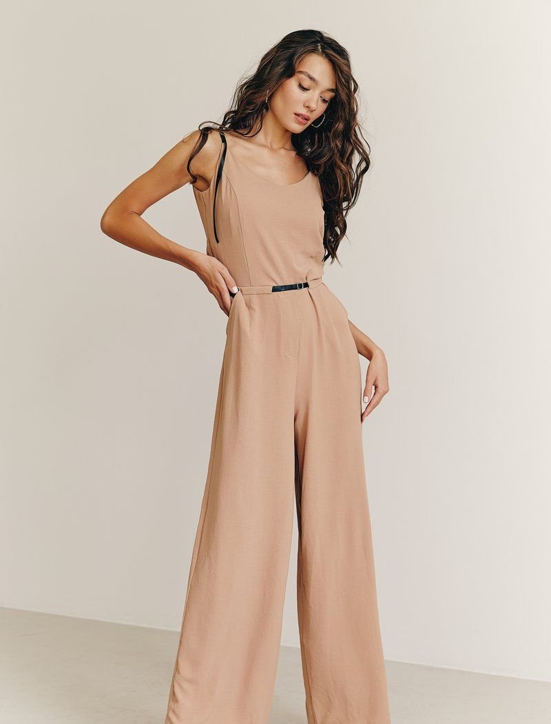 Beige jumpsuit with thin adjustable straps in black. It is also complemented by a belt that comes in the kit, there are pockets in the front and back. Wide trousers, in which your movements will be easy.