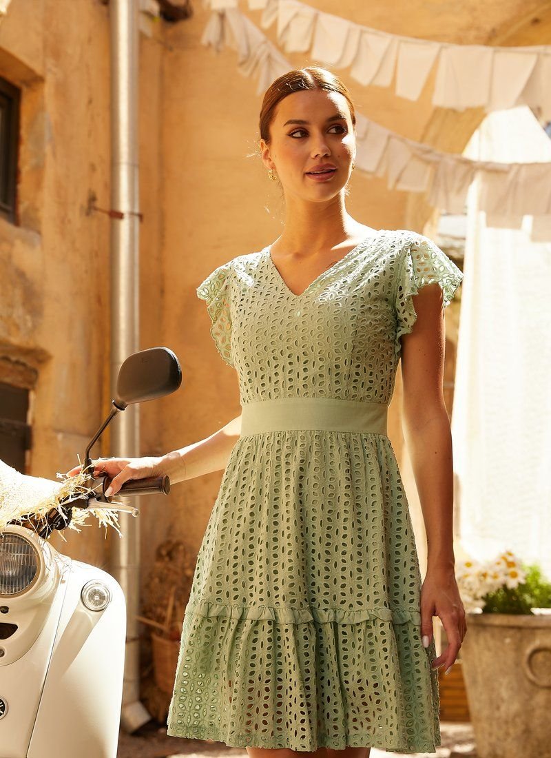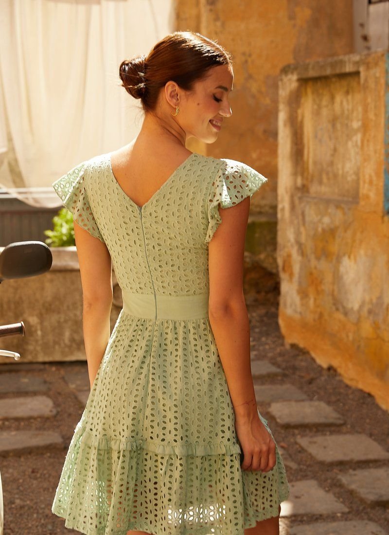 A short mint-colored dress made of cotton fabric with embroidery is the best solution for the summer season! A slightly flared skirt with a tie-in belt is complemented with ruffles. The triangular neckline delicately opens the chest and back, and the airy wing sleeves add lightness to the image.
