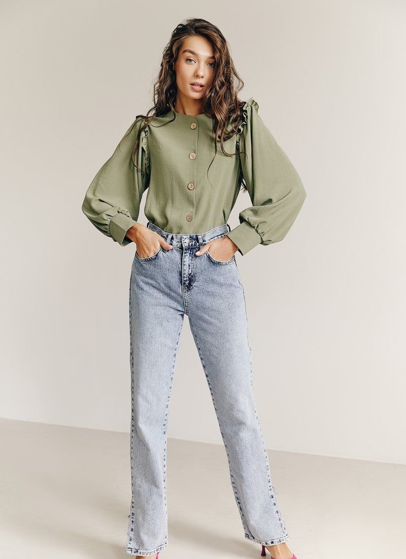 Blouse of a straight cut with a round neck on buttons stylized as wood. The long sleeve at the base is decorated with a thin neat frill, with wide cuffs. This blouse will go perfectly with both trousers and jeans.