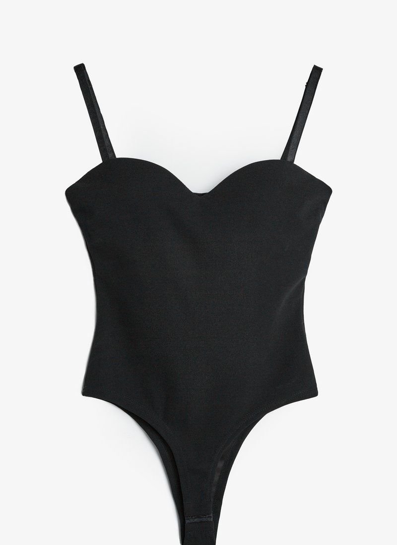 Black basic bodysuit with thin straps with cups. Adjustable straps and buckles in the form of hooks, thanks to which you can adjust the length, as well as the volume in the chest. This body will perfectly emphasize your figure.