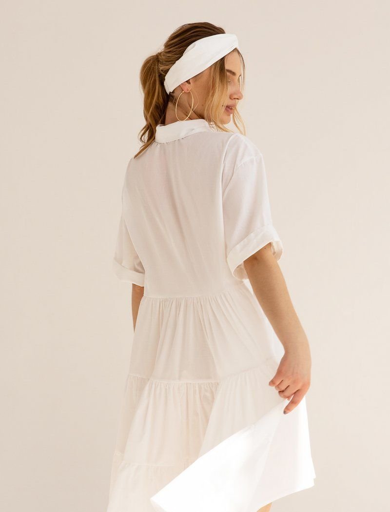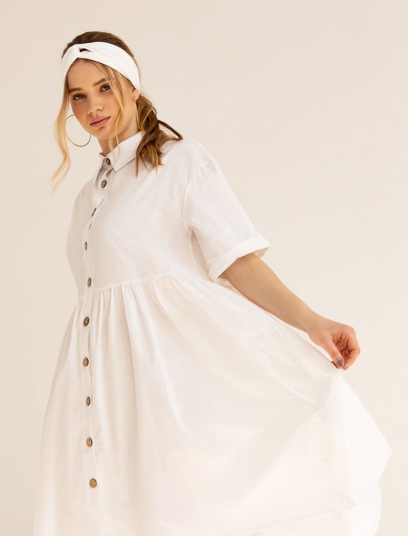 The white dress resembles an asymmetric shirt of the oversized silhouette, which was supported by Prada and Balenciaga in their FW'20/21 collections. Soft cotton was used for sewing the model. Short sleeves were supplemented with unfixed lapels. The set includes a headband with a voluminous weave.
