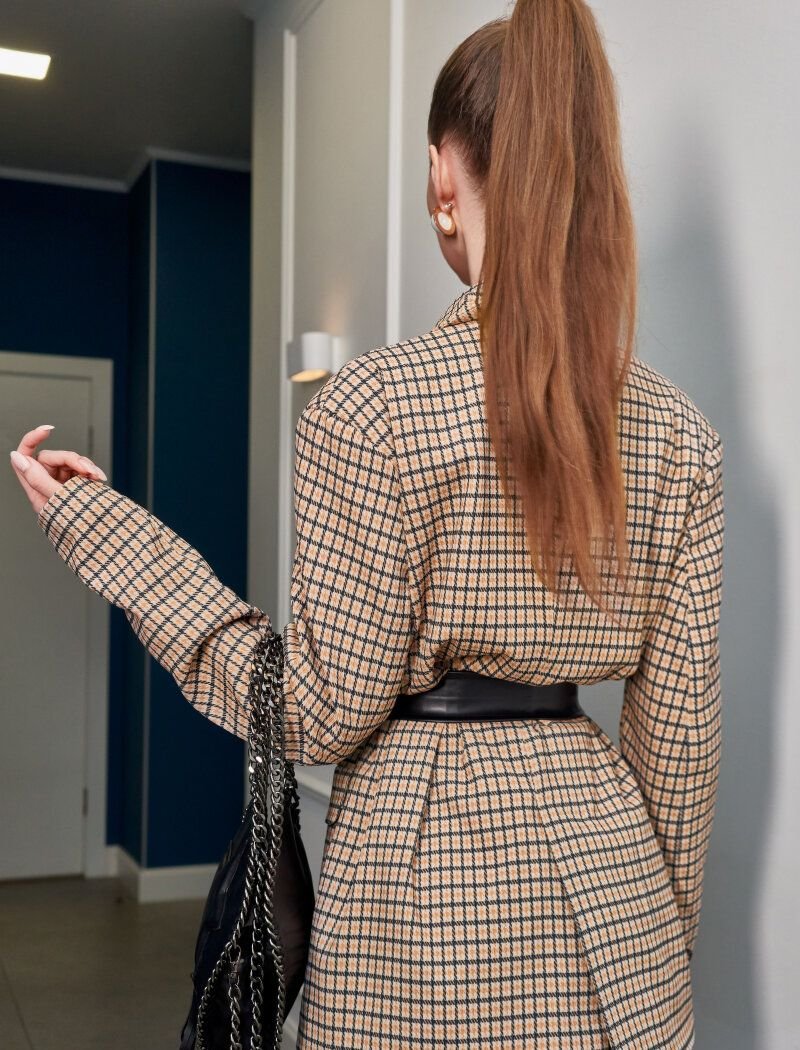 Checkered single-breasted jacket in the style of dadkor ("dad's jacket") on a satin lining. Classic turn-down collar|pointed lapels. Elongated cut. Modeling foam inserts in the shoulders|long sleeve. A button placket on the front|two welt pockets with a flap and a removable belt made of eco-leather.