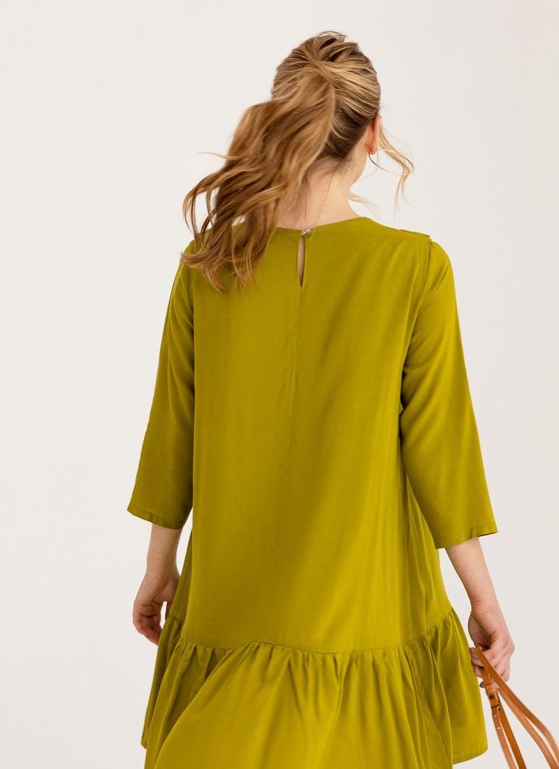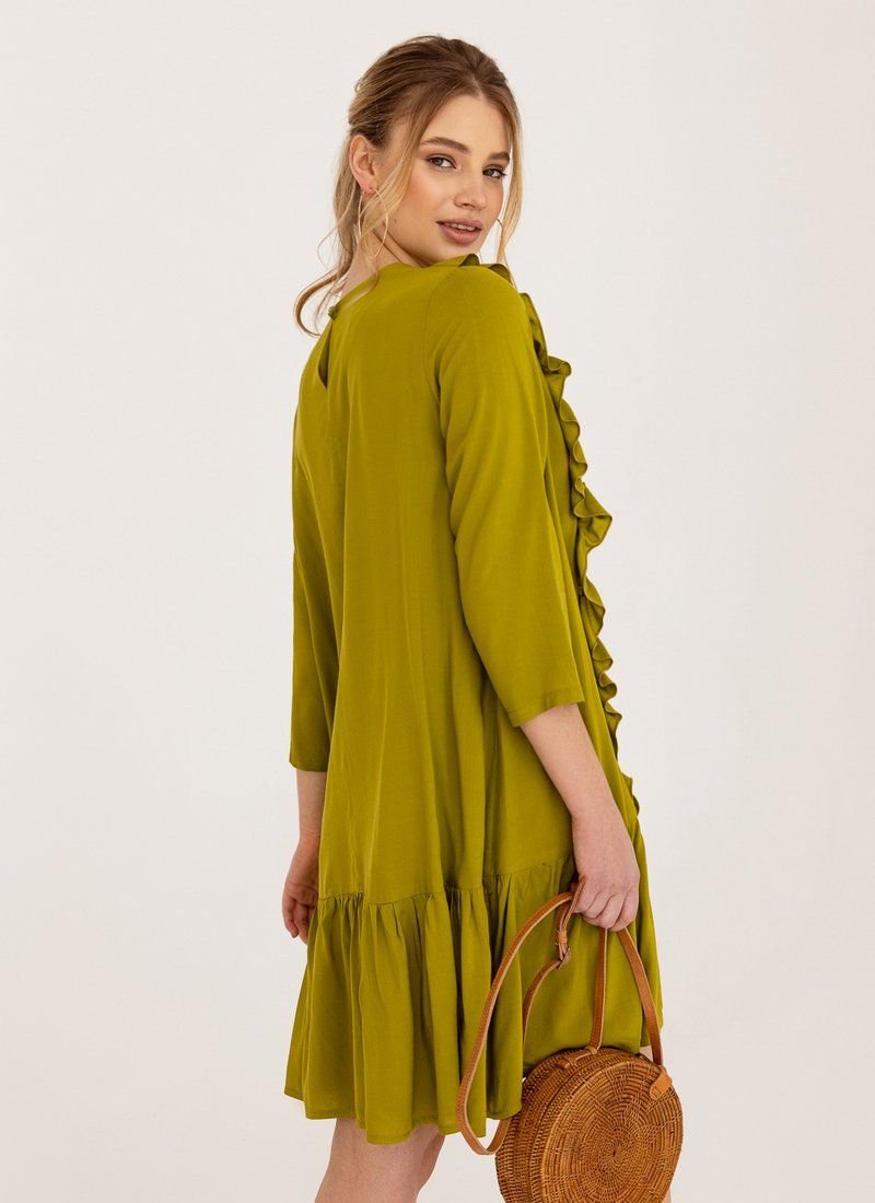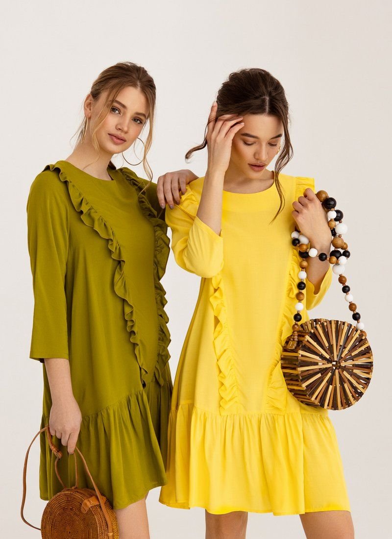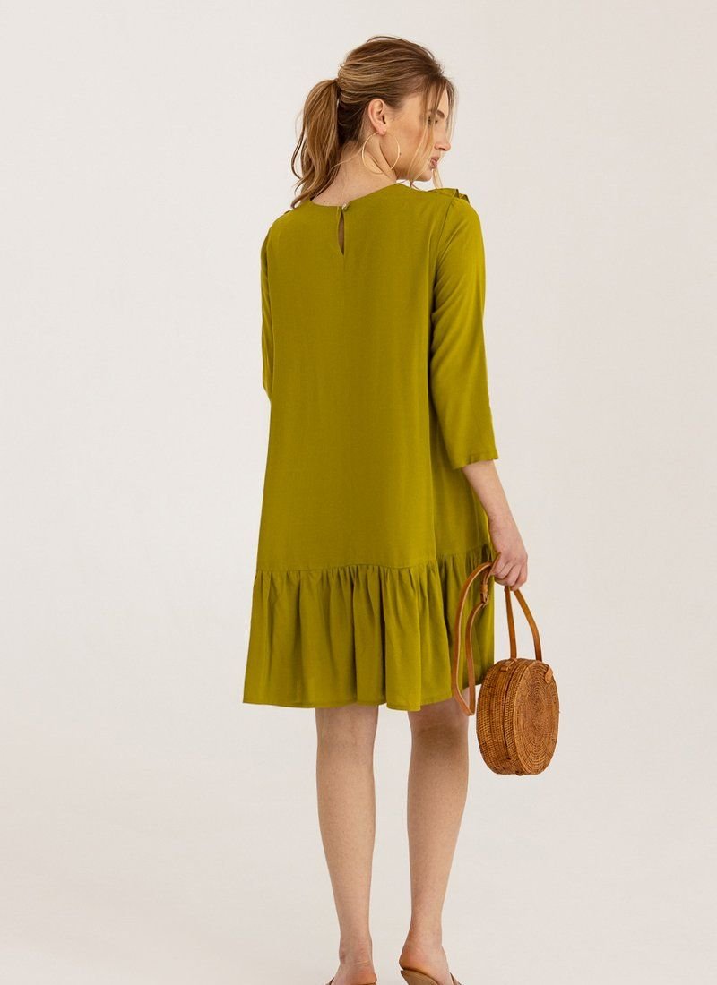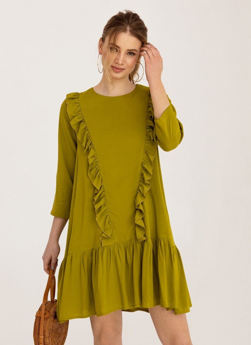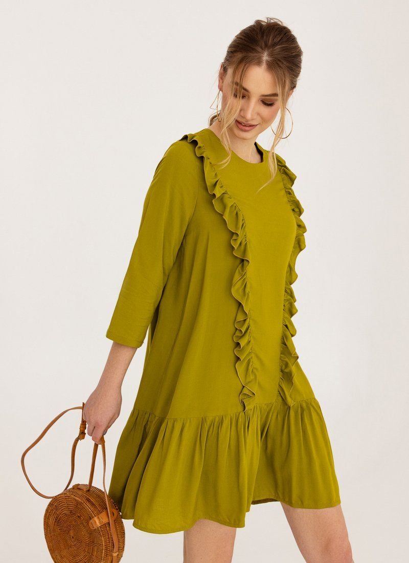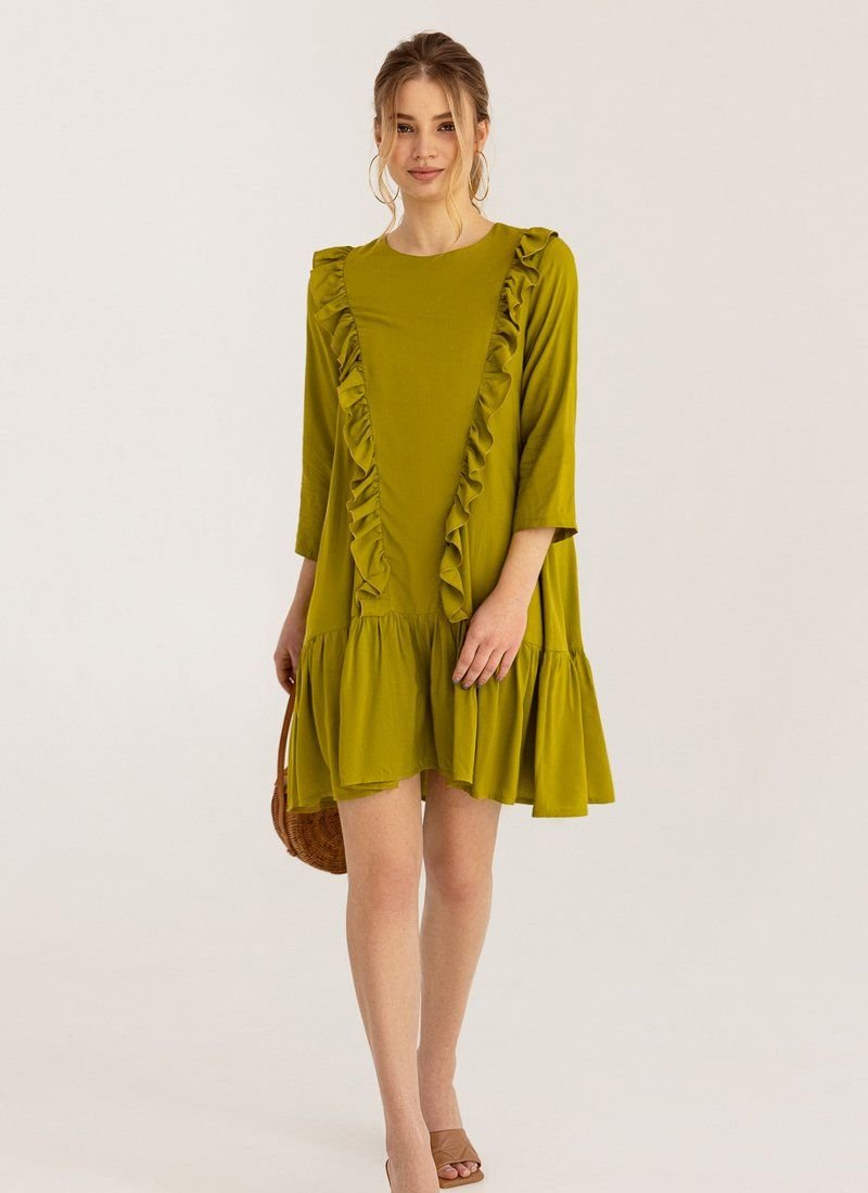 A loose dress is the epitome of romance. Olive shade and vertical ruffles work for the right impression. A wide flounce at the hem supports the image.