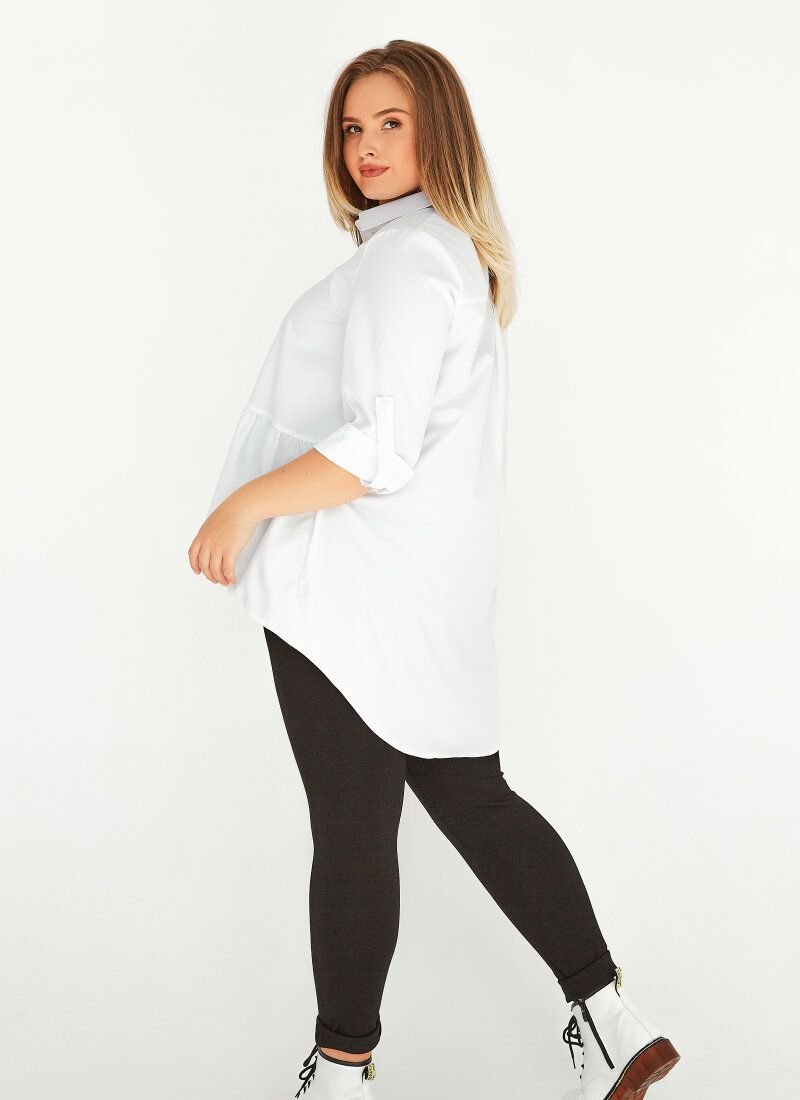 White shirt with a loose fit. Original design with an elongated back and a turn-down collar. In the front part, the model is complemented by a shuttlecock on the bottom edge. Adjustable sleeves. The shirt will add a romantic accent to your business look.