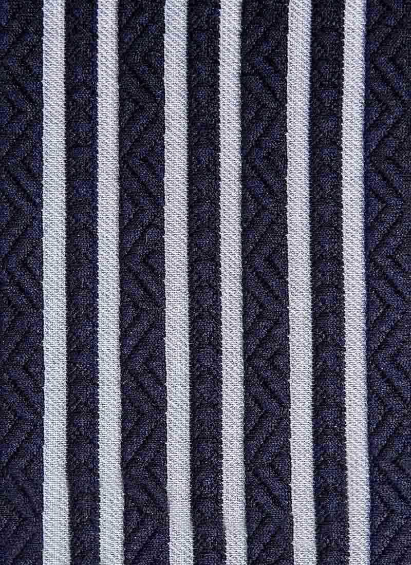 A striped knitted dress with contrasting elements: an unusual rounded hem with decorative buttons, a 3/4 sleeve with a cuff and a chest pocket with a "handkerchief".