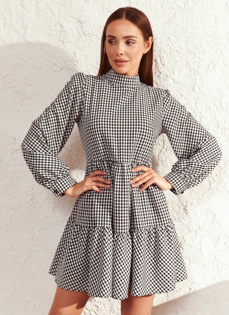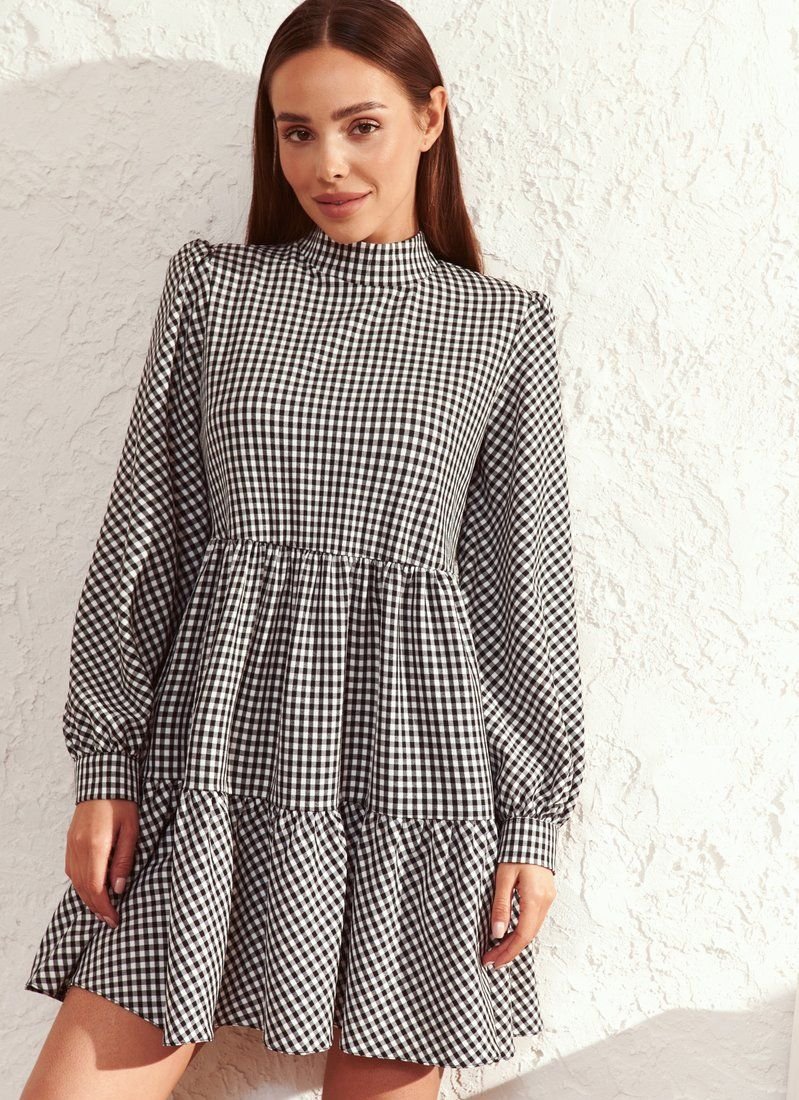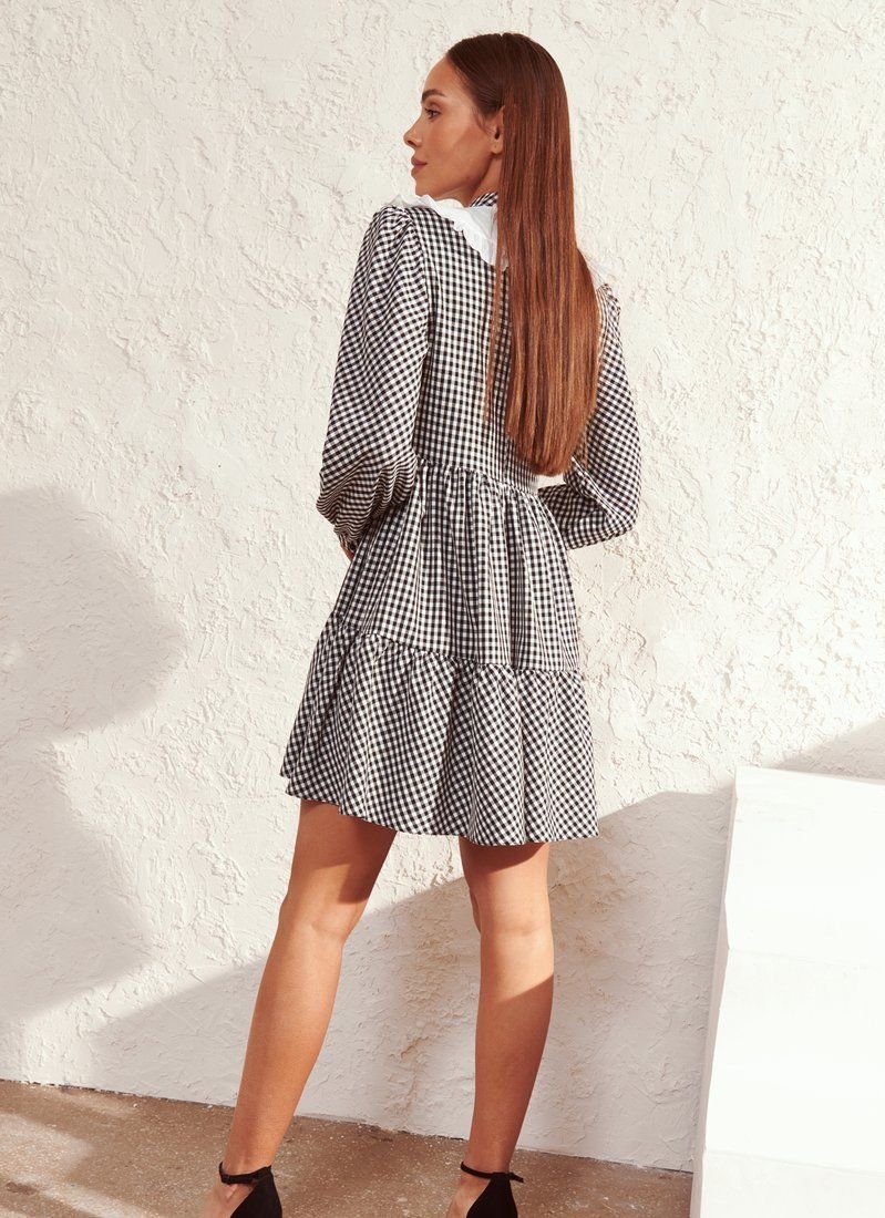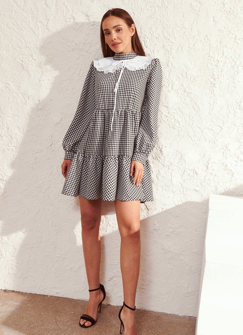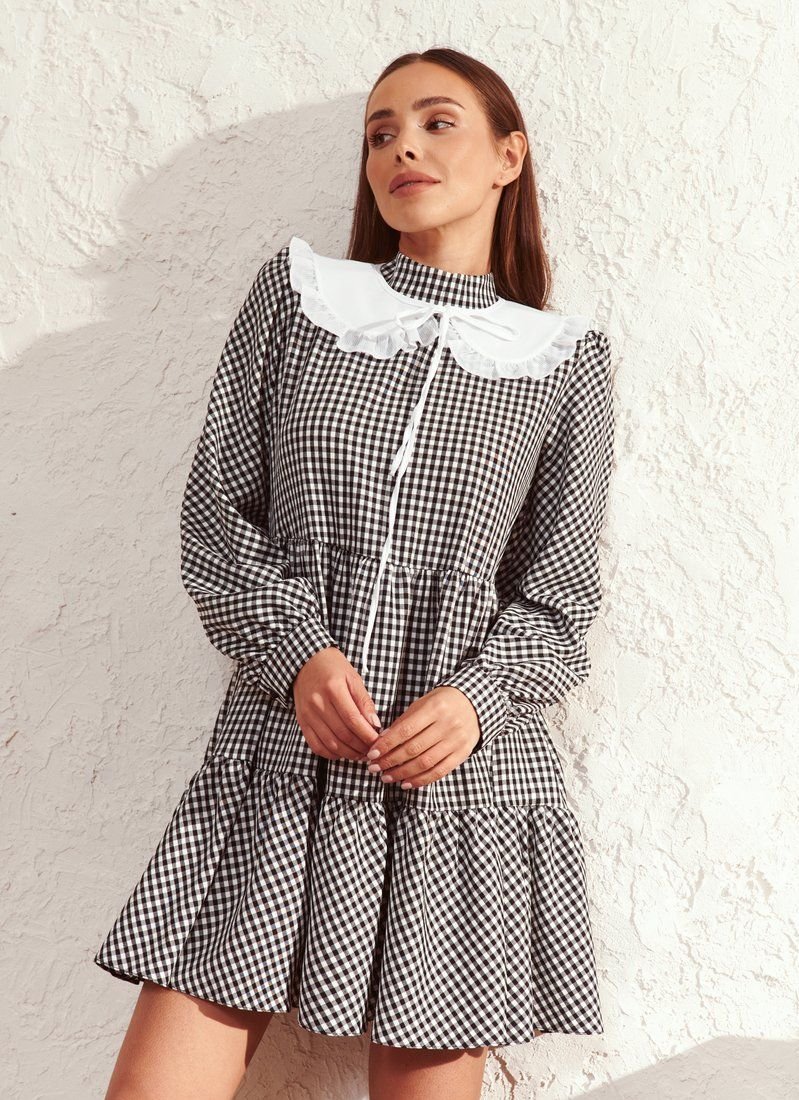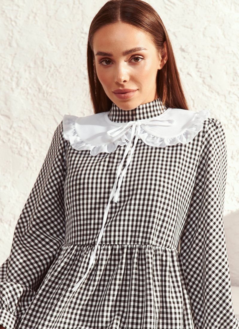 A loose dress in a small black and white check was decorated with one of the romantic trends of SS'21 according to Vogue: an accent collar with ruffles. Similar details could be seen at the seasonal shows at Alessandra Rich.