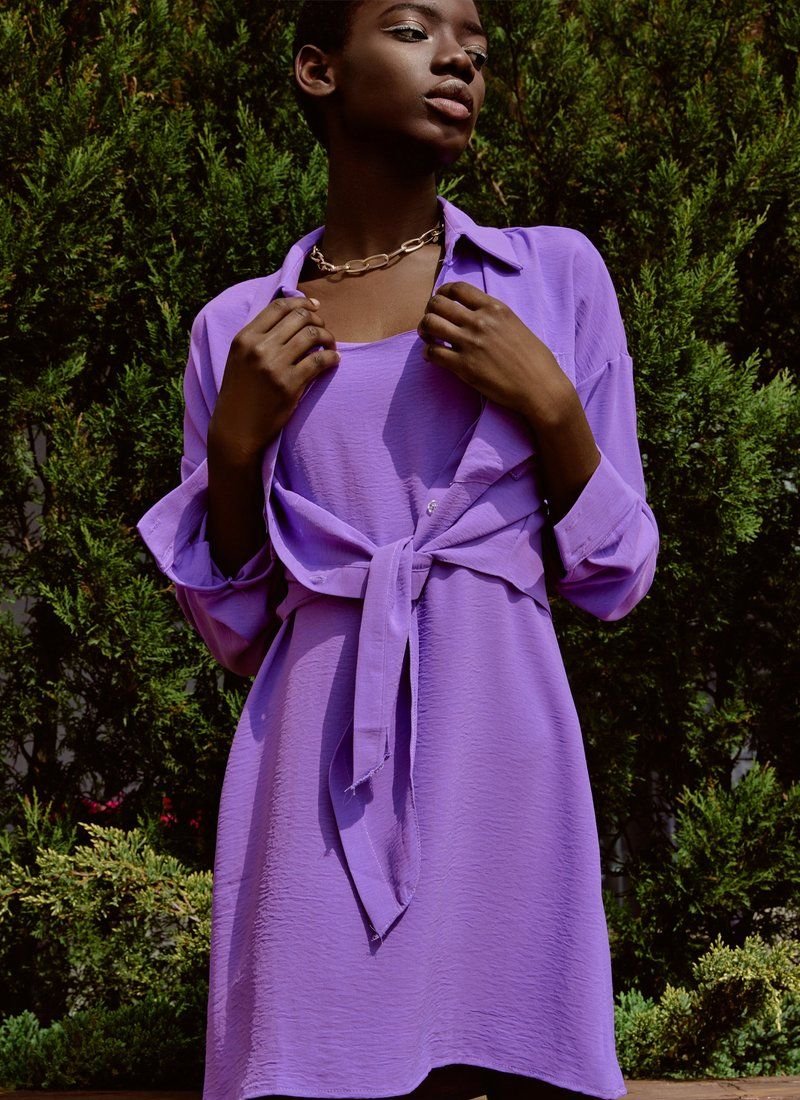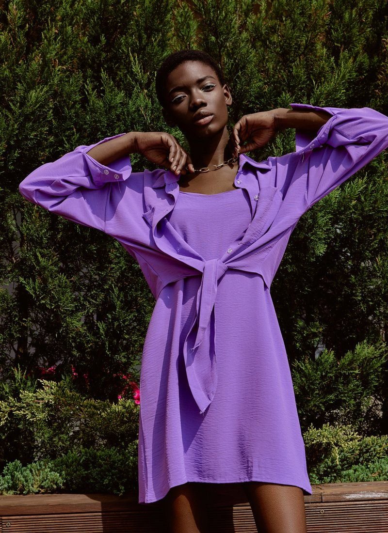 The purple color sets the tone for a set of a slip dress and a loose shirt. The model was made of light material with a pleasant texture. The shirt was supplemented with a tie-knot in the front, and the dress with narrow non-adjustable straps.
