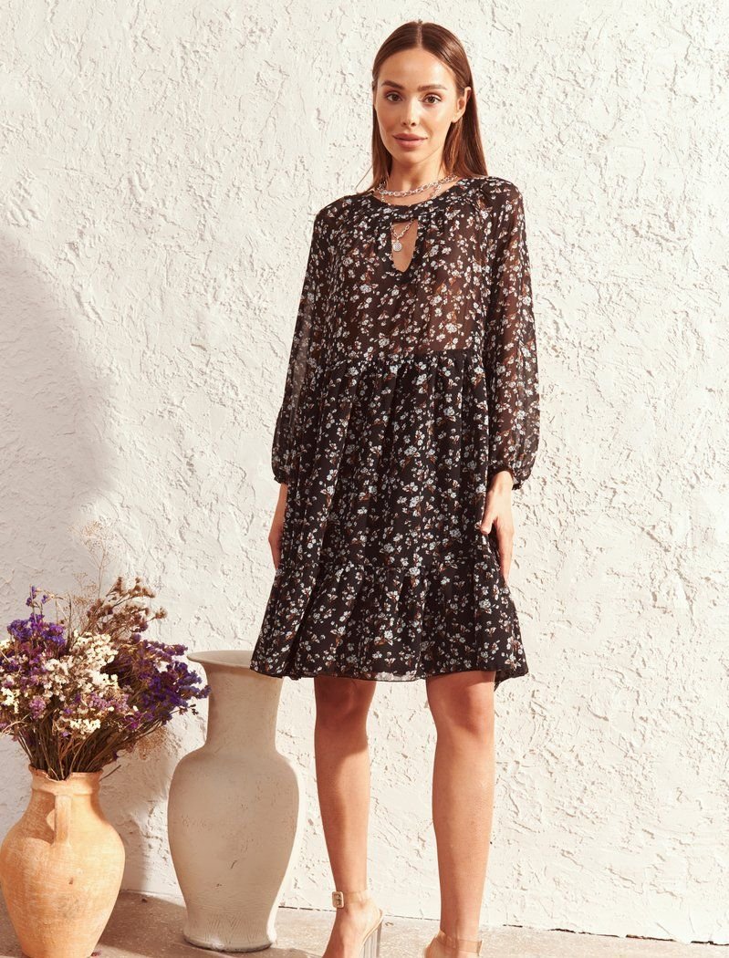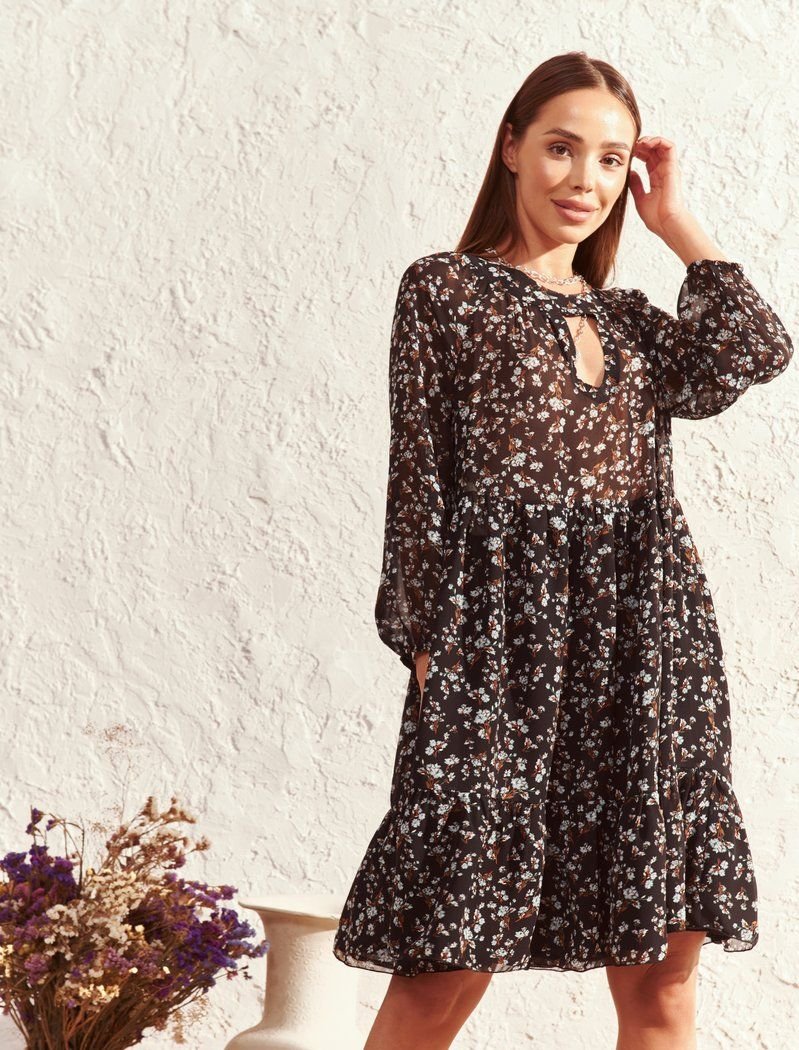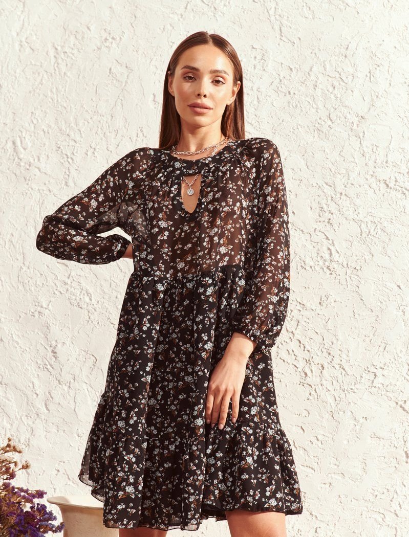 The black dress has acquired a new sound due to the material and floral print, which was included in the list of fashion trends of the SS21 season according to Vogue. Light chiffon was used for sewing the model. The romantic mood of the pattern and the lightness of the fabric were enhanced by a loose cut and a flounce on the hem. The decollete area was accentuated with a teardrop-shaped neckline.