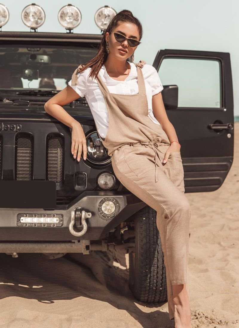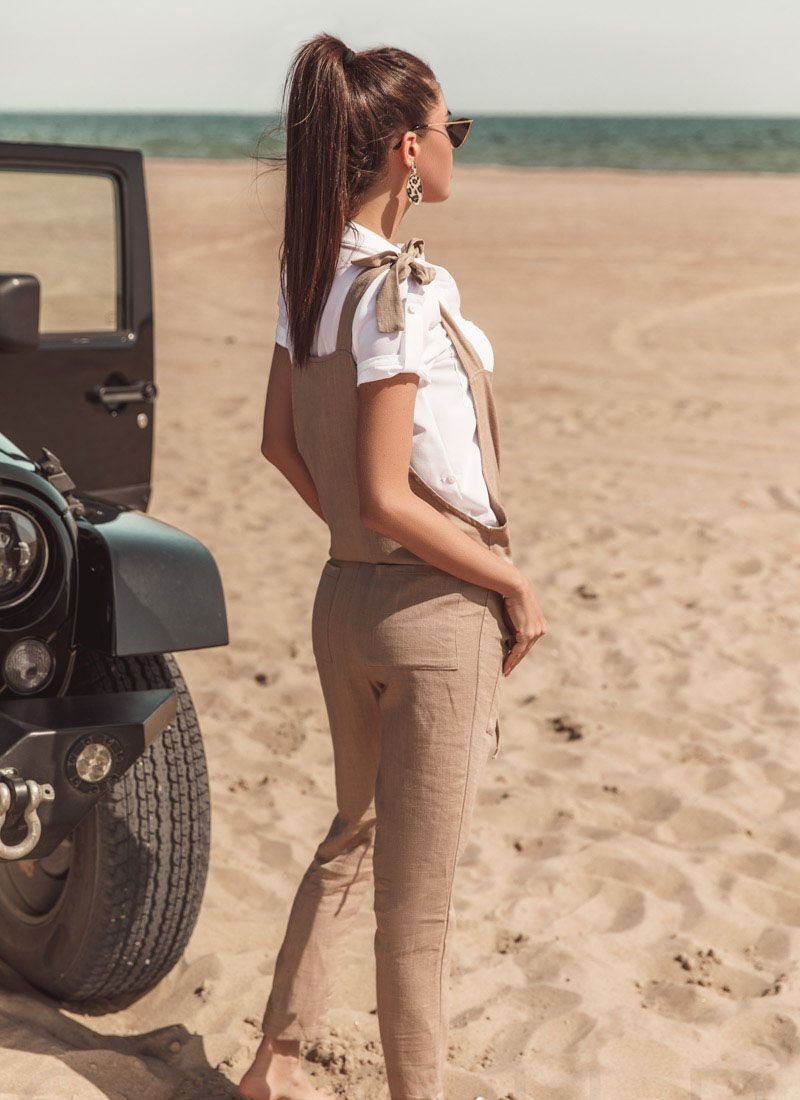 A loose-fitting jumpsuit with a square neckline, ties at the waist and two roomy patch pockets in the front.