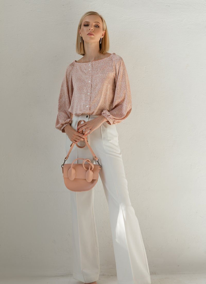 Beige silk blouse with small white polka dots, with a boat neck and an elastic insert on the back. Buttons on the front, long loose sleeve with thin cuffs.