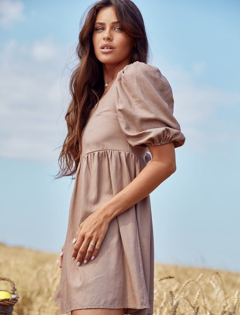 A short dress with an inflated waistline, made of soft linen fabric. The open back is complemented by elastic lacing. A spectacular puffy sleeve with an elastic cuff and a neat square neckline on the chest. the dress is perfect for everyday looks in the hot season.