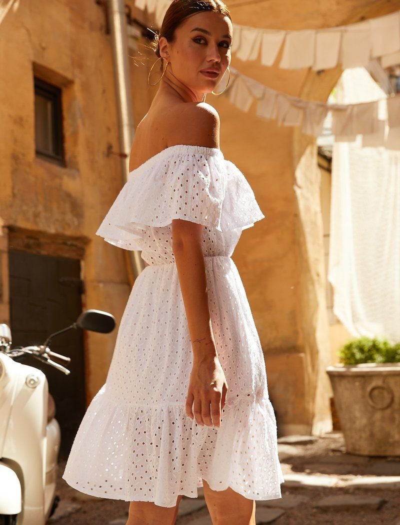 A white summer dress made of cotton fabric is the best choice for the summer season. Open shoulders and a bodice decorated with a flounce give the dress a romantic mood. The semi-transparent flared skirt is complemented by a closed elastic band at the waist, which allows you to wear the dress with maximum comfort.