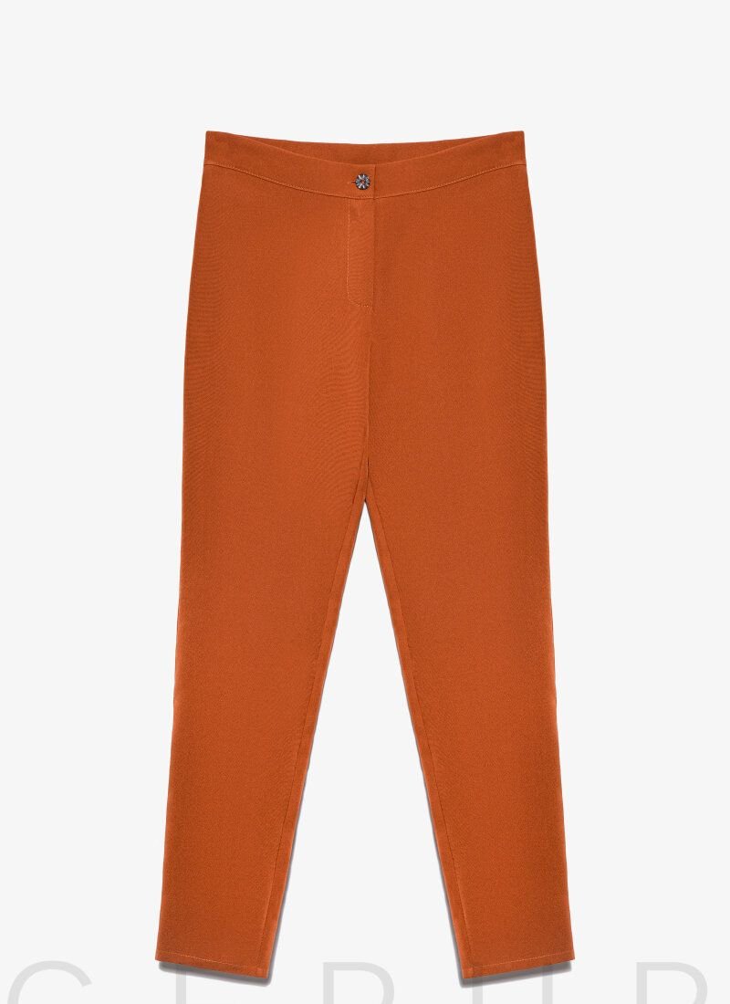 Business suit of terracotta shade. Fitted blazer for the smell with lapels, long sleeves, pockets-deceptions and a removable belt. Trousers with a narrow cut and a high fit.