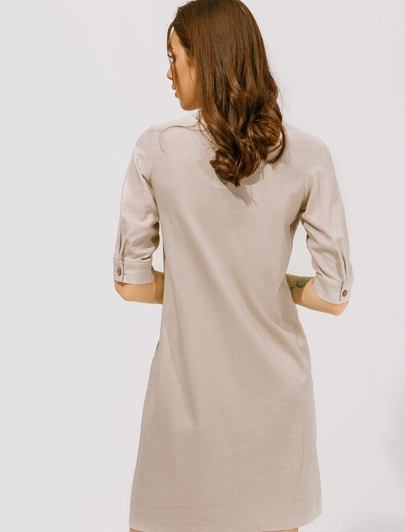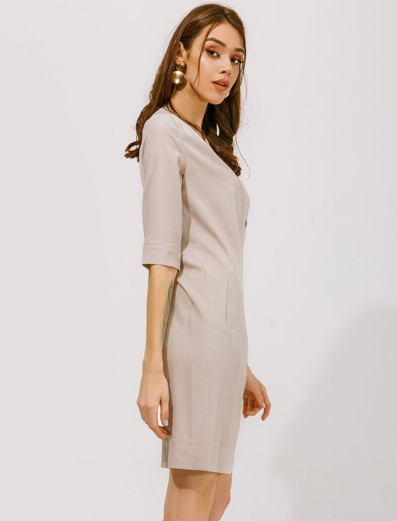 Laconic beige linen dress. V-neck, button placket on the collar. 3/4 sleeves, straight cut, two welt pockets in the front.