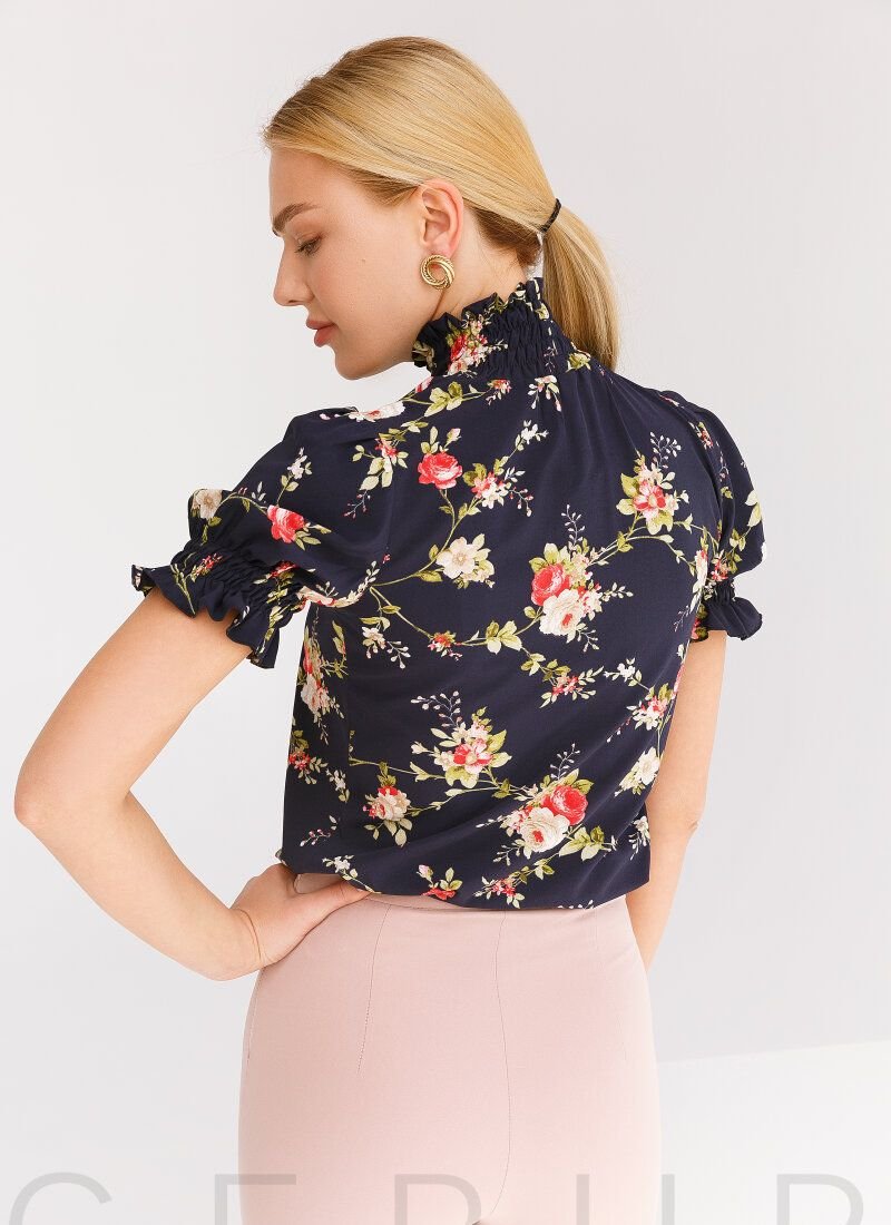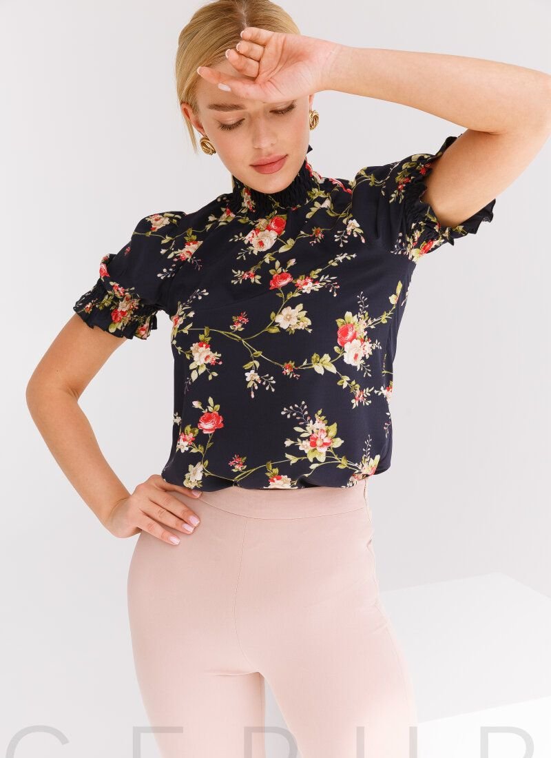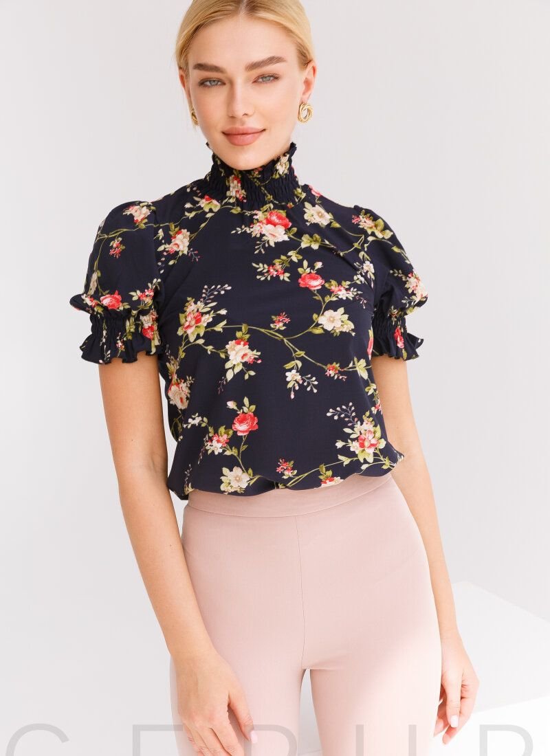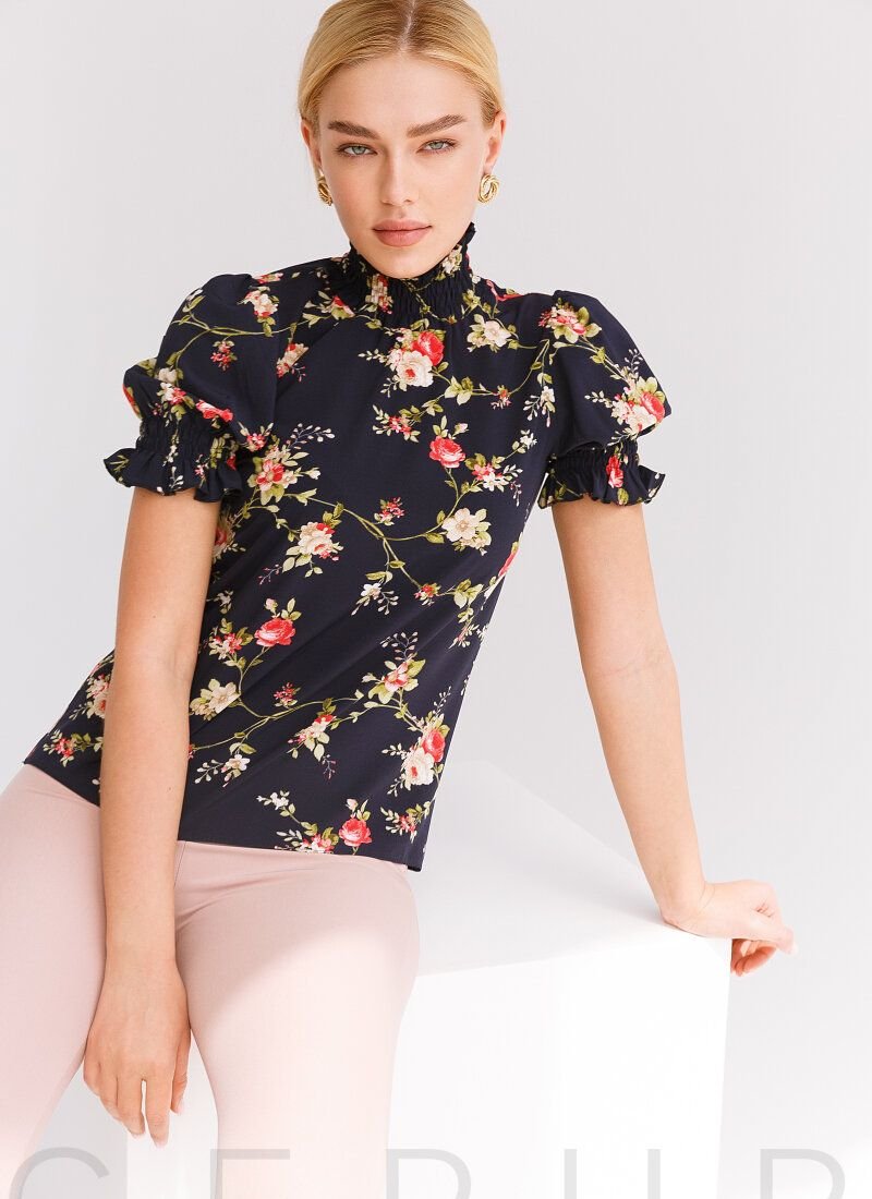 Light blouse with floral print. Elastic stand-up collar, straight cut.