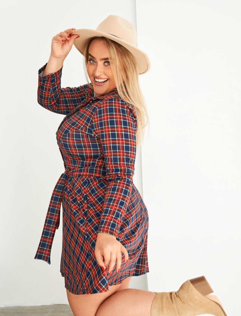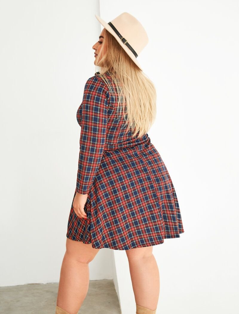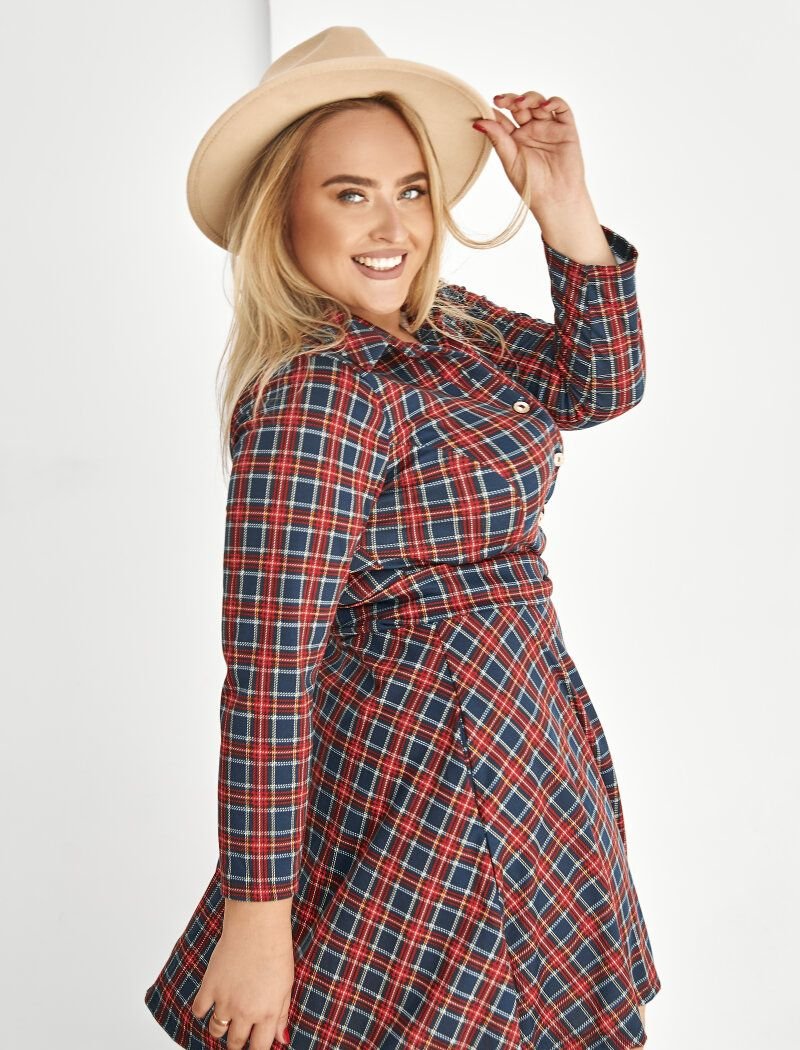 The dress is made of a pleasant French knitwear with a bright print in a Scottish check. A feminine fitted cut with a cut-off waist is complemented by a removable belt in an identical color scheme. A button placket descends from the turn-down collar to the waistline.