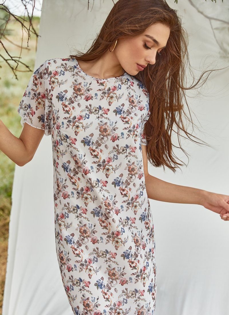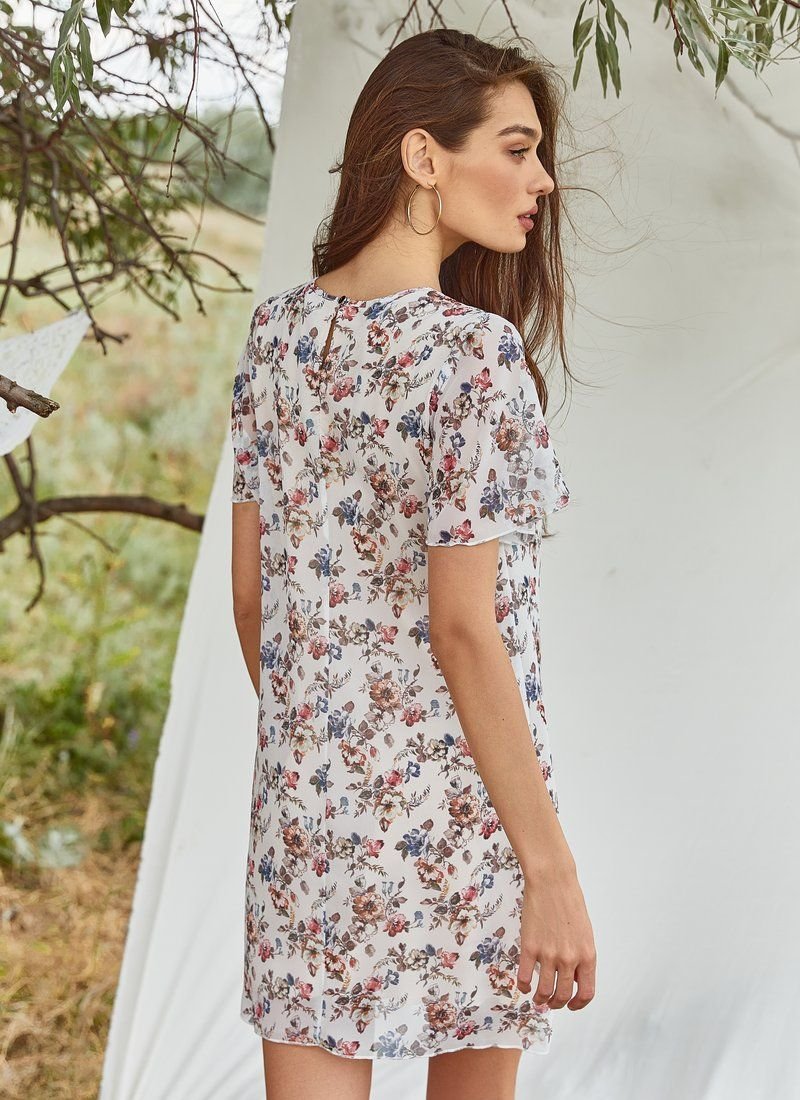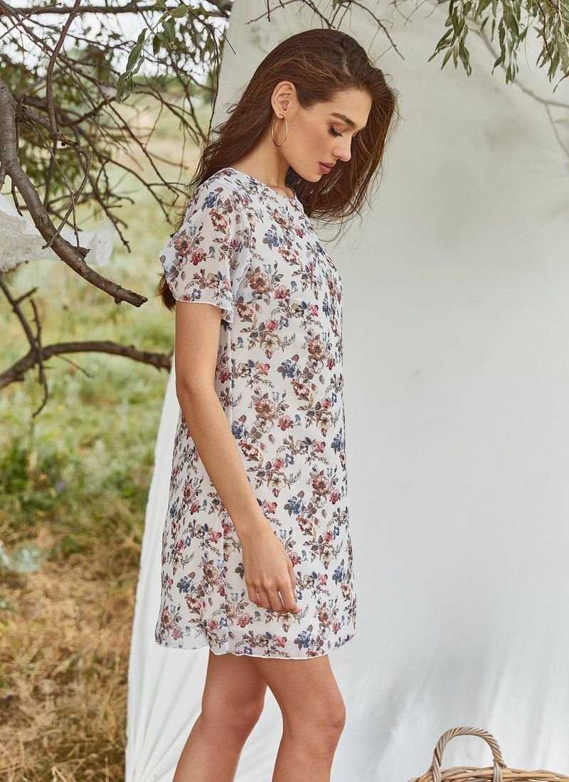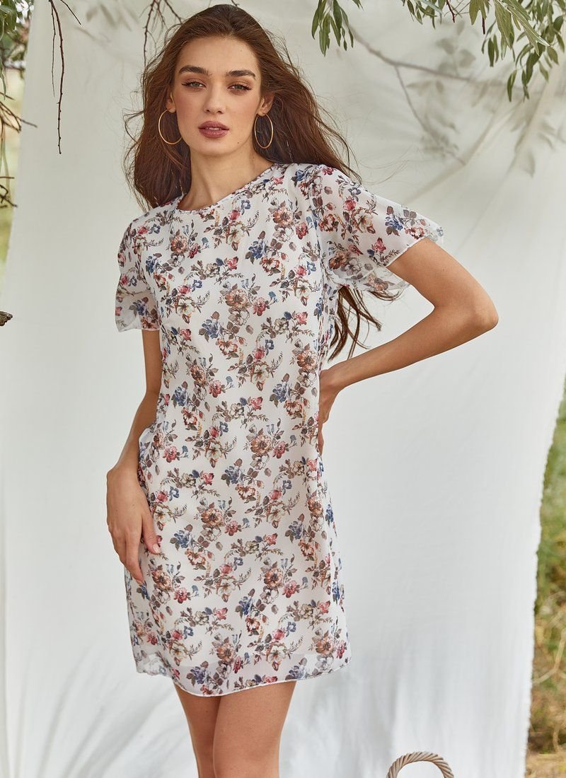 Summer dress with a laconic cut made of chiffon in a floral print. Neat round neckline on the chest and teardrop-shaped on the back. Short wing sleeves and a short straight-cut skirt. The dress is made of airy fabric, which makes it versatile for the summer season.