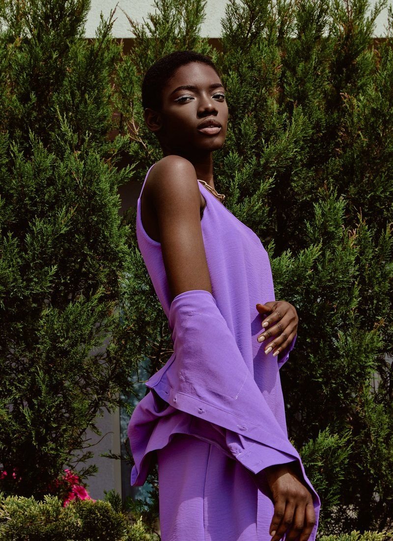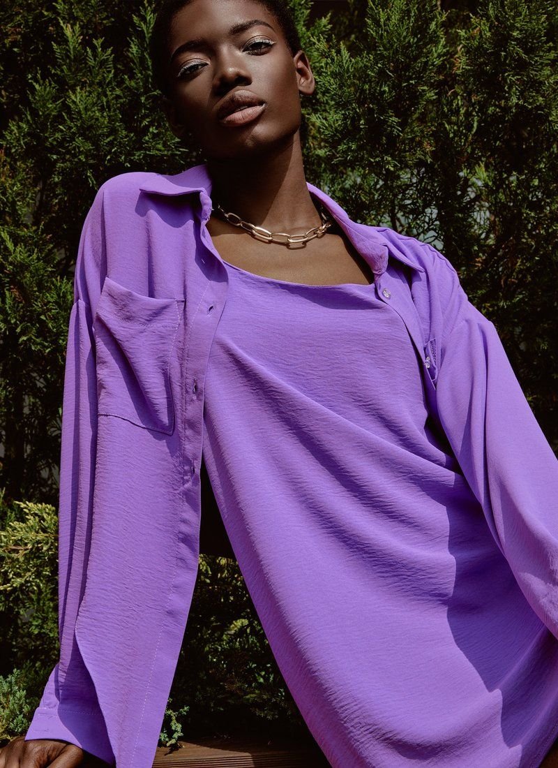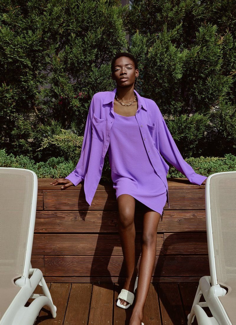 The purple color sets the tone for a set of a slip dress and a loose shirt. The model was made of light material with a pleasant texture. The shirt was supplemented with a tie-knot in the front, and the dress with narrow non-adjustable straps.