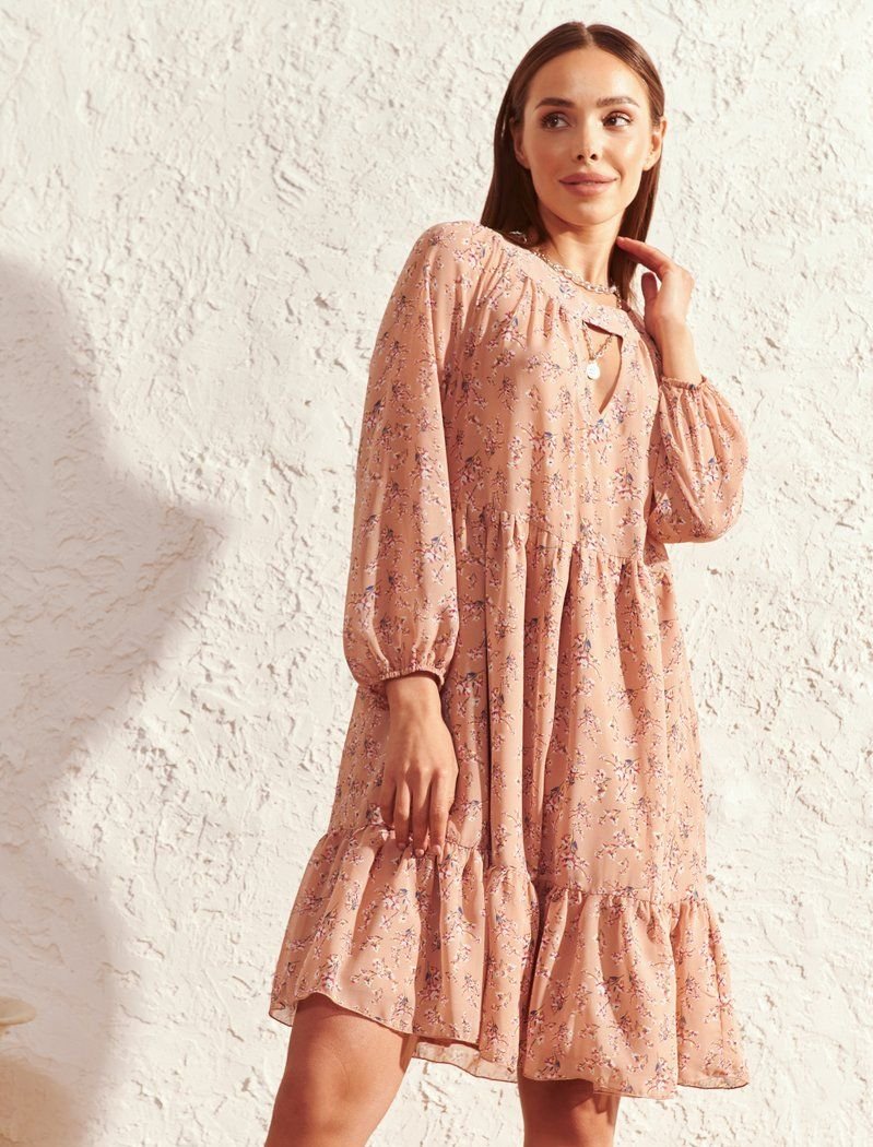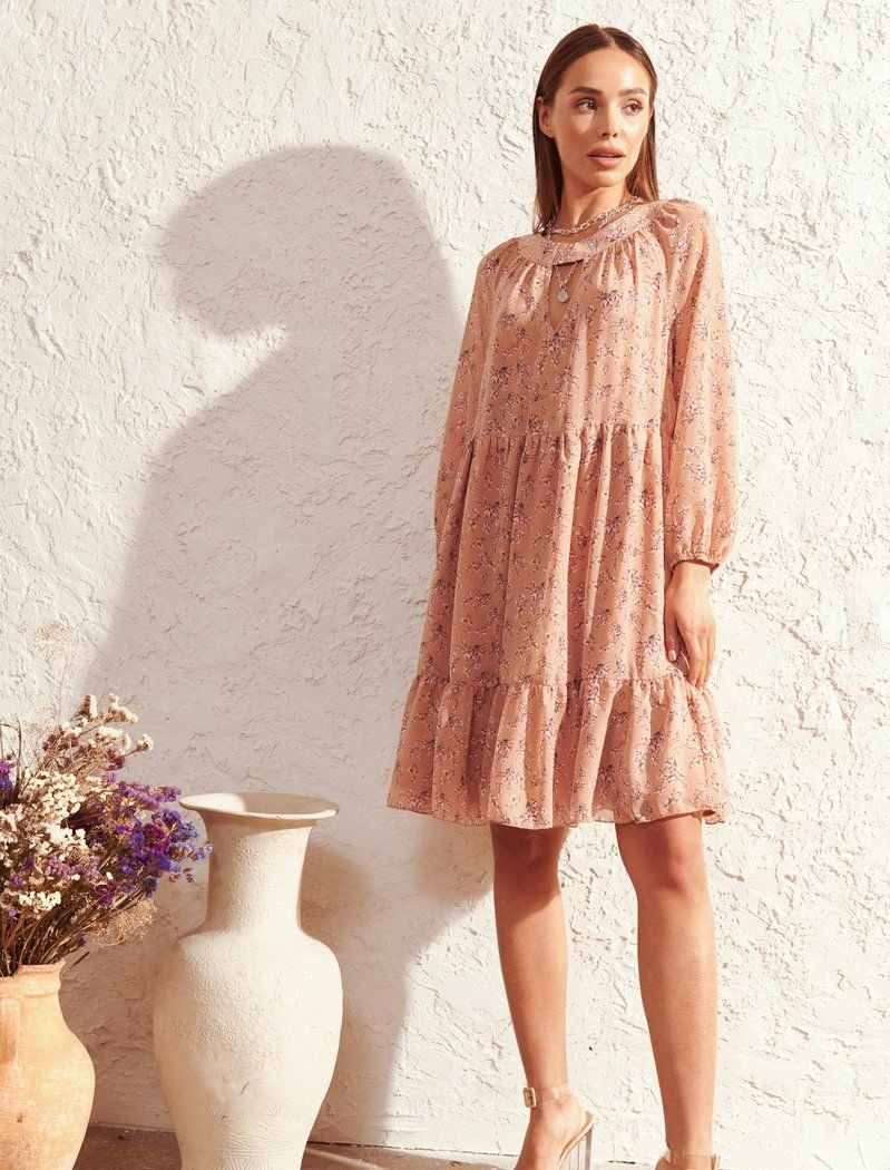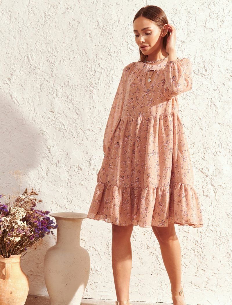 The powdery dress has acquired a new sound due to the material and floral print, which was included in the list of fashion trends of the SS21 season according to Vogue. Light chiffon was used for sewing the model. The romantic mood of the pattern and the lightness of the fabric were enhanced by a loose cut and a flounce on the hem. The decollete area was accentuated with a teardrop-shaped neckline.
