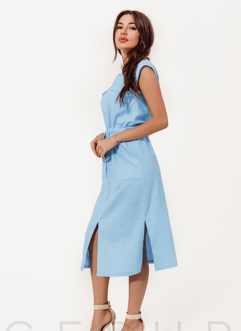Casual dress of classic cut without sleeves, round neck, ties at the waist, rounded hem with slits on the sides and two pockets, patch with a flap on the chest and cut-off on the skirt.