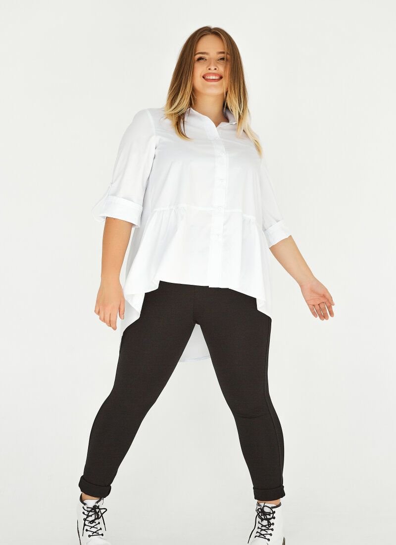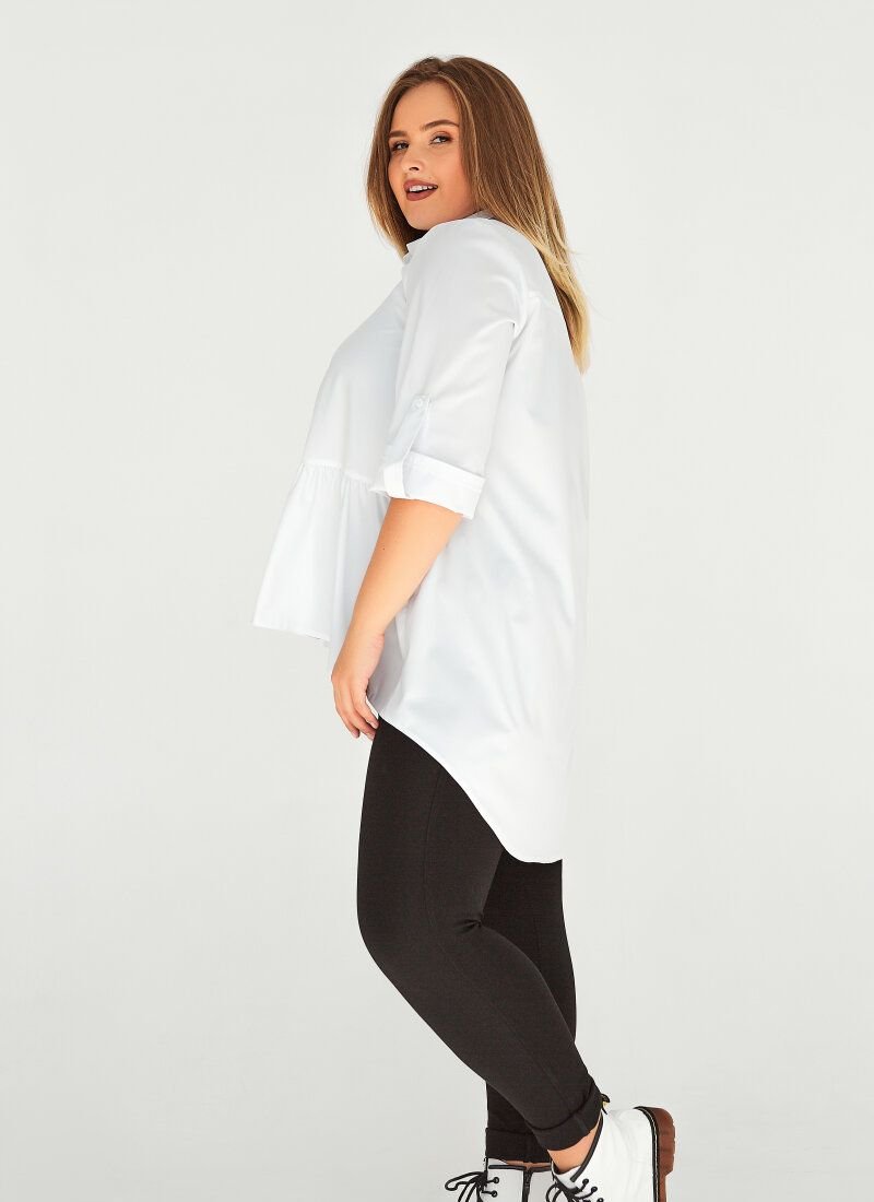 White shirt with a loose fit. Original design with an elongated back and a turn-down collar. In the front part, the model is complemented by a shuttlecock on the bottom edge. Adjustable sleeves. The shirt will add a romantic accent to your business look.