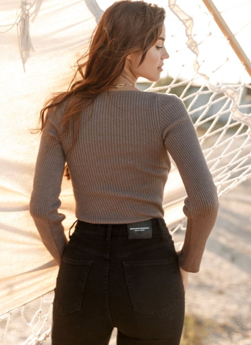 A coffee-colored jumper made of textured ribbed knitwear is complemented by a curly neckline that accentuates the decollete area. The form-fitting cut of the model emphasizes the silhouette.