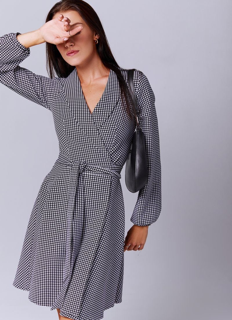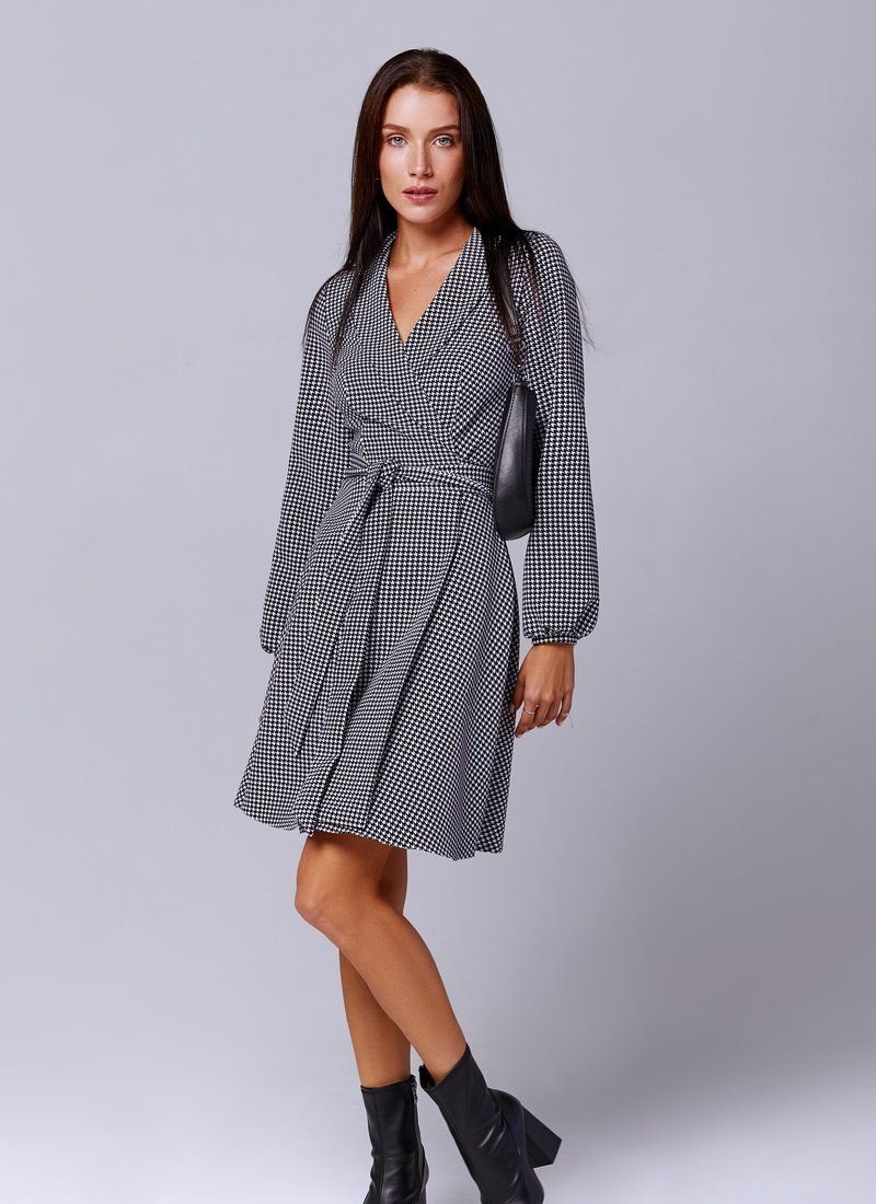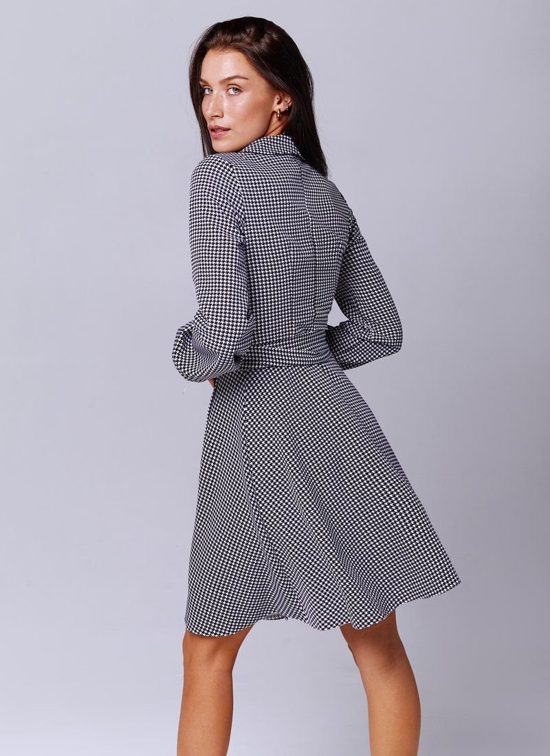 Mini dress for the smell in a trendy goose's foot. The classic black-and-white print was used in their collections by brands such as Michael Kors and Dolce & Gabbana. The model is presented with long sleeves, lapels and a flared skirt.