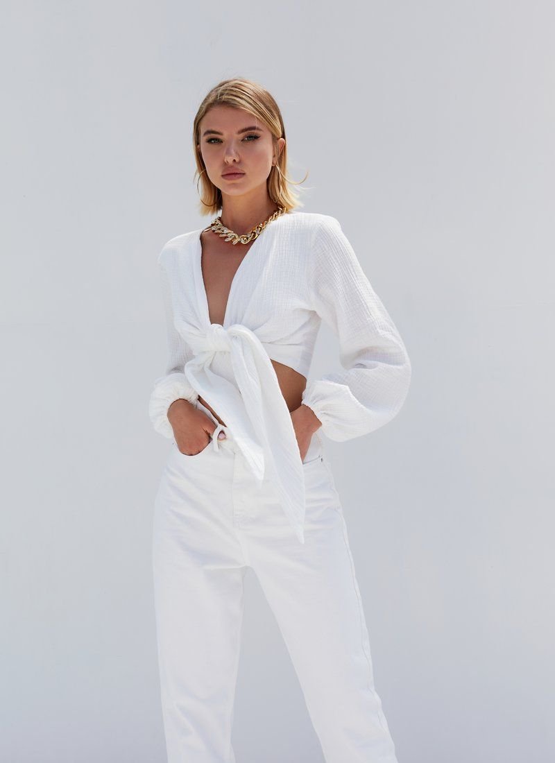 A white blouse will make even the simplest look more romantic with jeans or a skirt. The correct mood of the shortened model was set with the help of a knotted tie in front. The product was sewn from thin soft cotton.