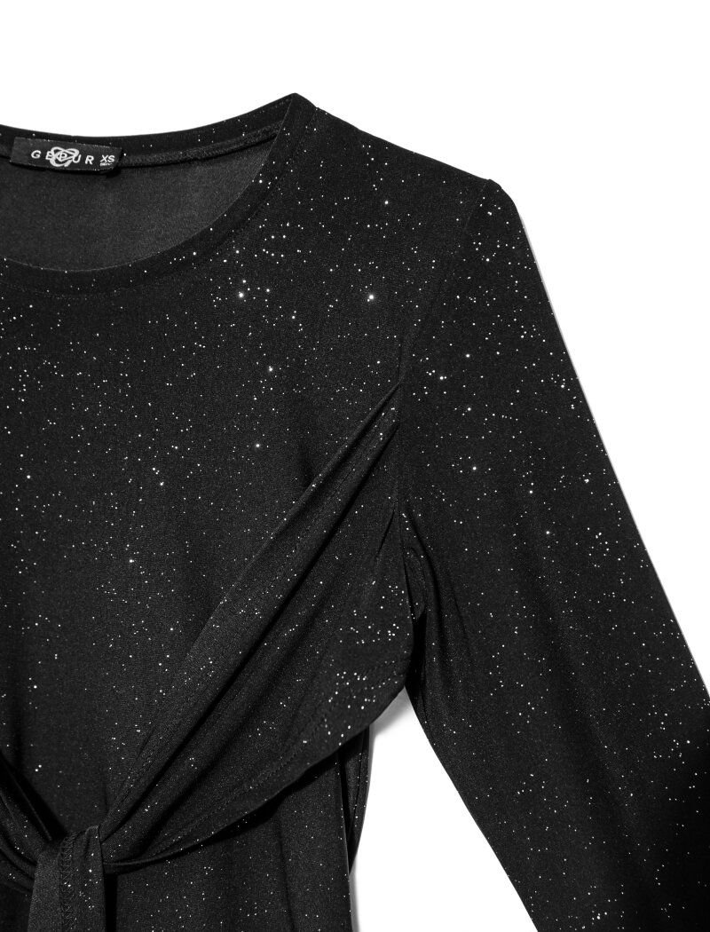 A short dress with shimmering particles will be a good way to attract attention to yourself. With this task, he is helped to cope with a deep neckline and a pleasant fabric to the body. The model was included in the autumn-winter 2019 collection. In creating a romantic image, this dress has no equal: it remains only to stand on heels and pick up a miniature purse.