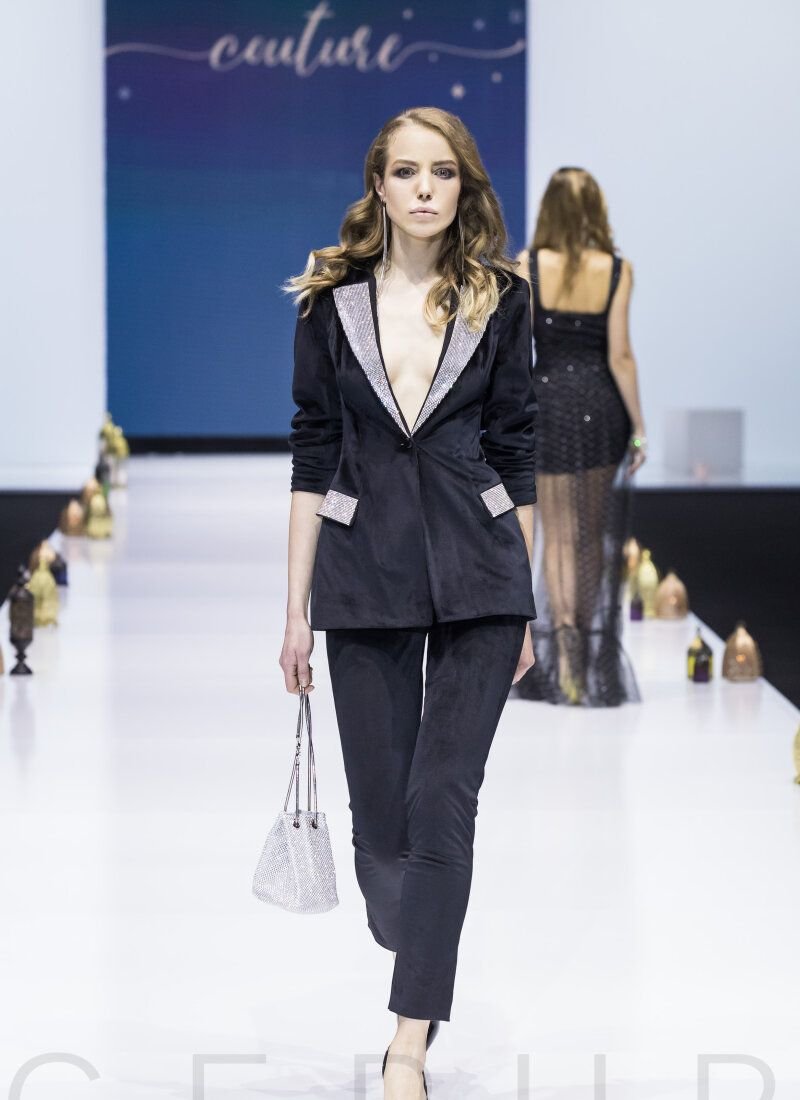 In the autumn-winter 2019 collection, Gepur designers focused on refined velvet fabrics. A black suit consisting of a fitted jacket with an accentuated shoulder line, a shimmering shawl collar and cropped trousers with a high fit can become the main character of your evening outfit. To create a wow effect, our stylists recommend wearing a jacket without a base top. The star collection is presented by the famous blogger, it-girl and finalist of "Miss Belarus 2016" Masha Lobanova.