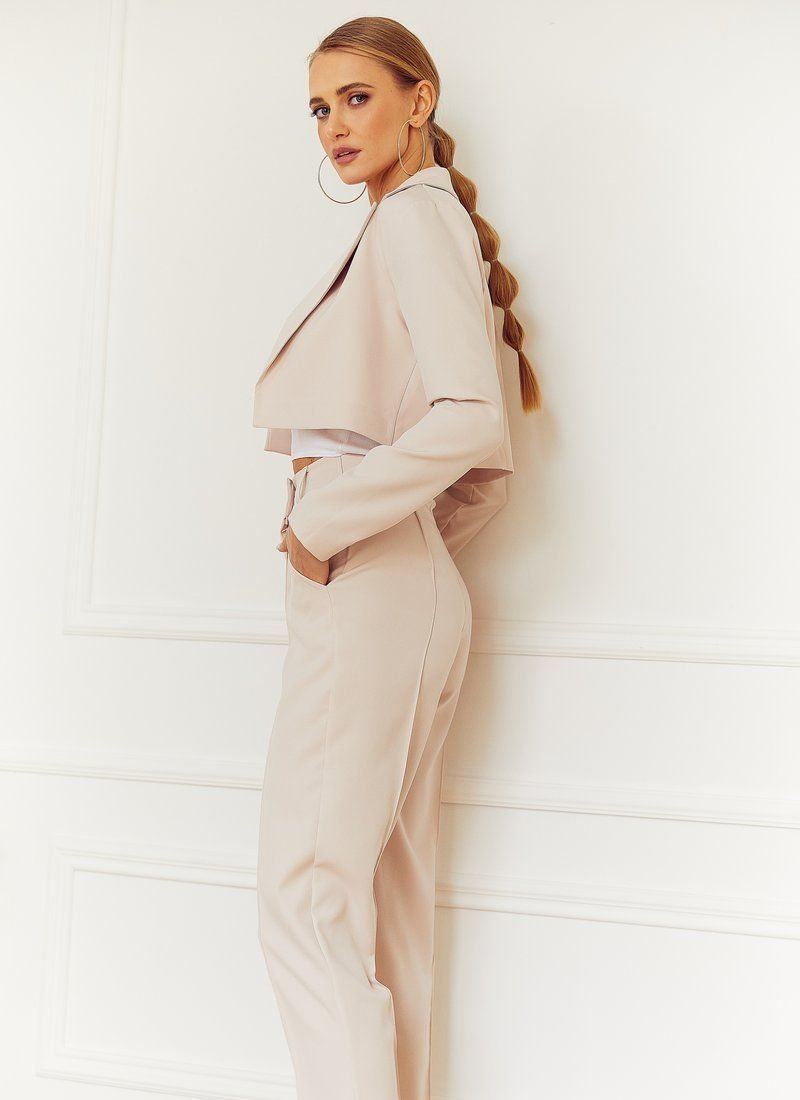 A suit of a basic beige shade will easily fit into your everyday wardrobe. The model supports the trend for a shortened cut, in the spirit of Alexander McQueen and Alberta Ferretti at the FW'20/21 shows. The jacket was supplemented with an imitation breast pocket, and the trousers with arrows and fixed lapels.