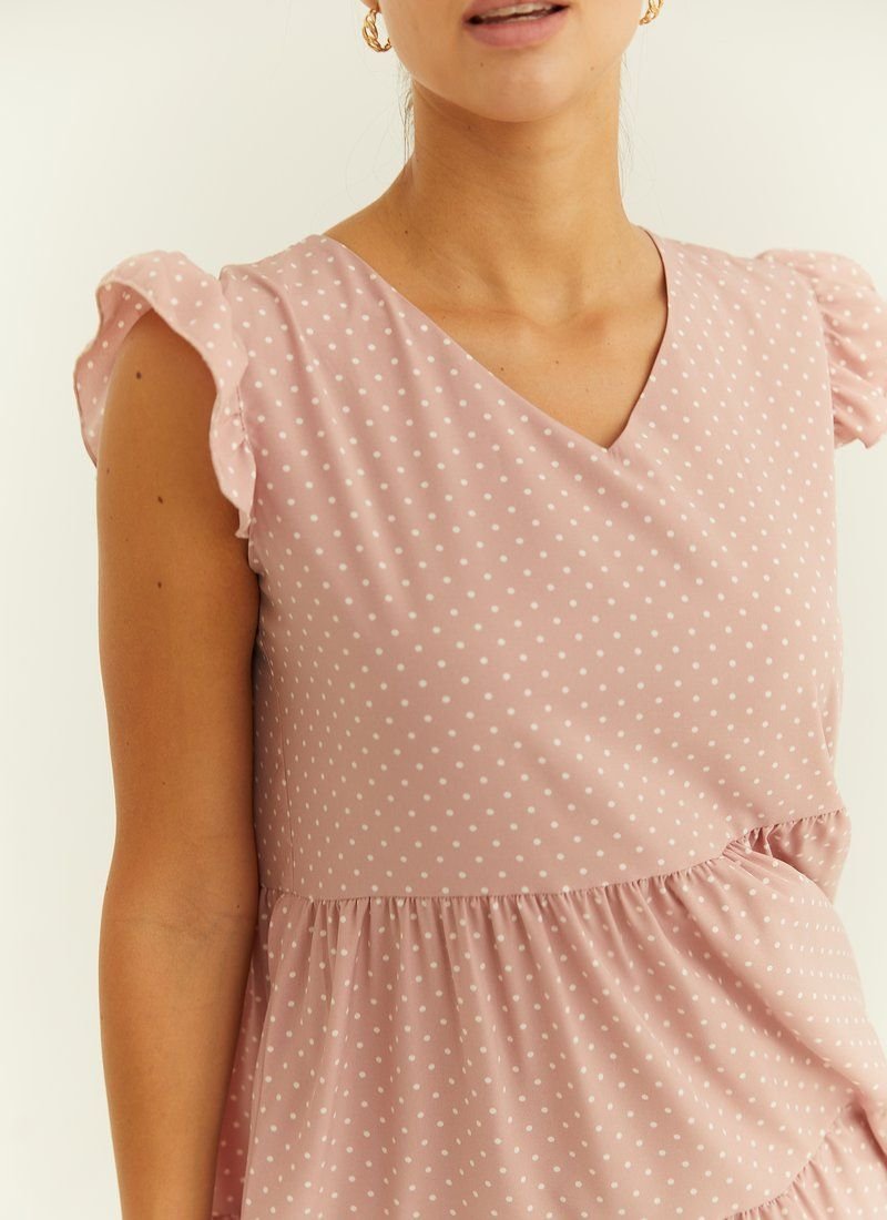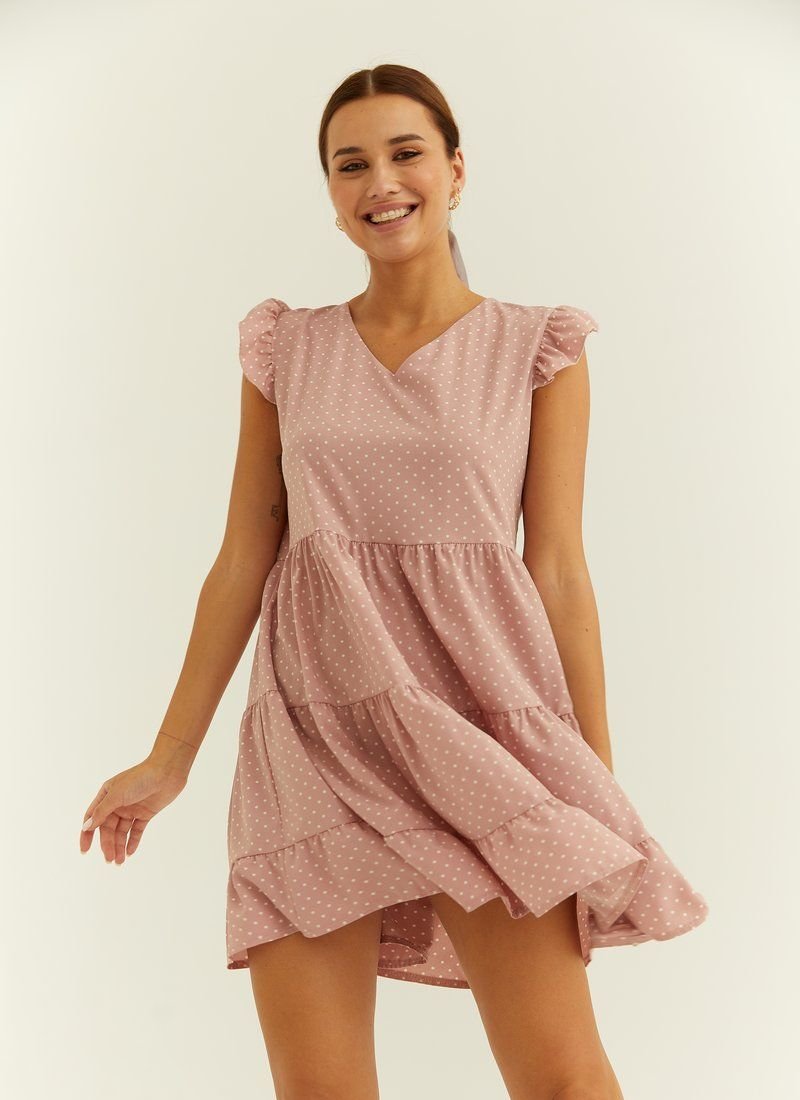 A short dress of a powdery shade, made of flowing fabric. A small v-neck on the chest, short wing sleeves and a tiered skirt, which gives the dress lightness. The model is decorated with a contrasting print in small polka dots.