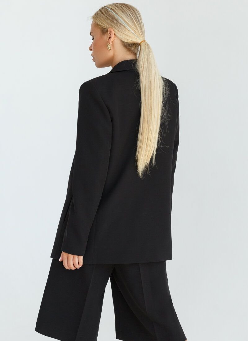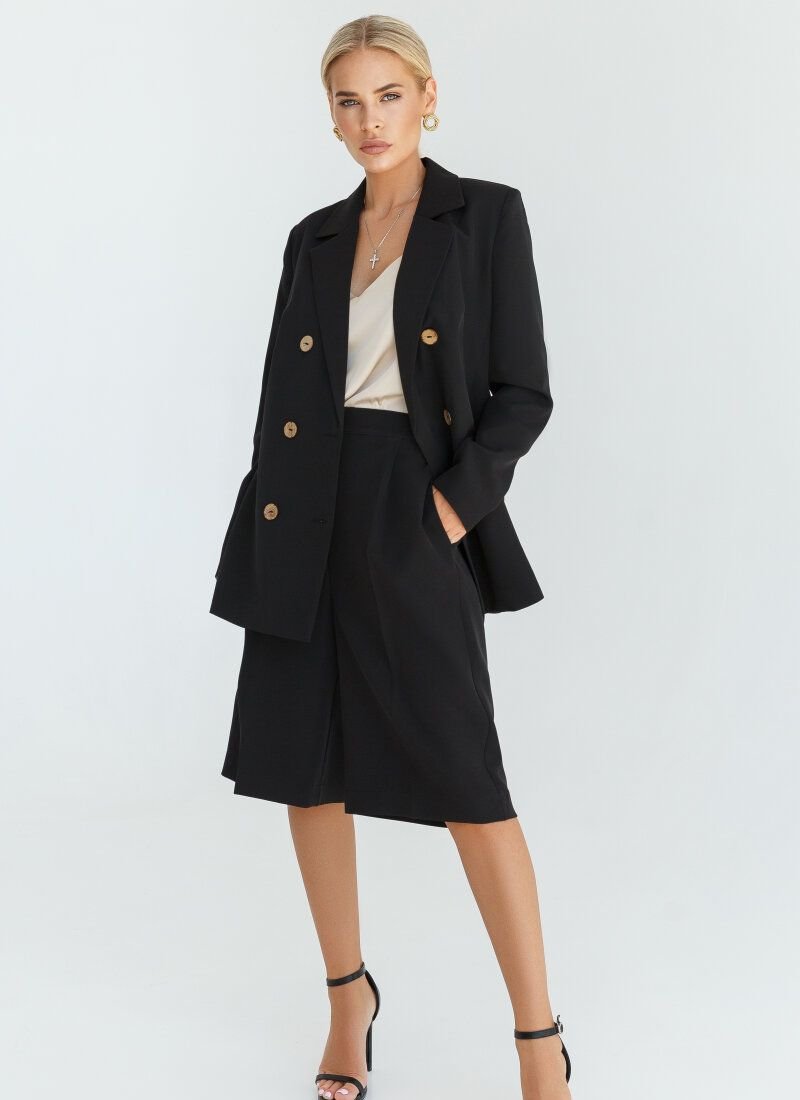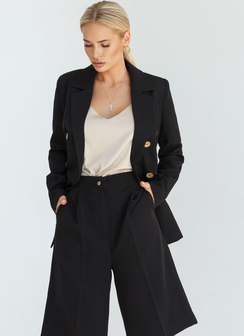 The black suit is suitable both for the office and for evening walks. Double-breasted jacket with a turn-down collar with lapels. Bermuda shorts with a high fit and fixed arrows. The composition of the material adds shine to the model. The jacket and shorts are complemented by welt pockets.