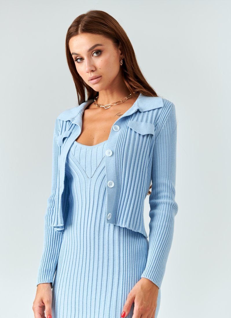 The actual set of knitted fabric in a rib. It includes a form-fitting dress with thin straps and a cardigan with a turn-down collar, chest pockets and textured buttons.