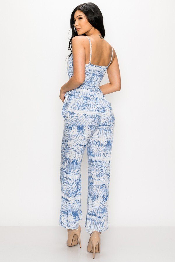 Imported S.M.L TROPICAL LEAF PRINT TIE WAIST JUMPSUIT 100% Rayon Blue PRI