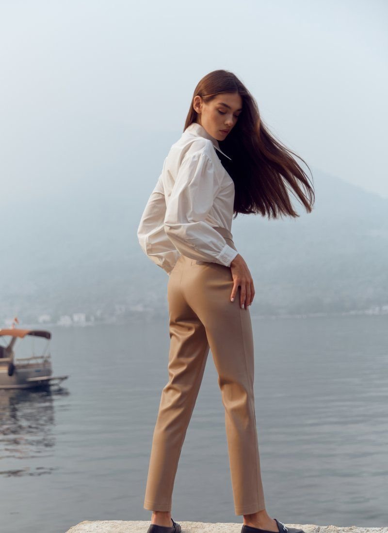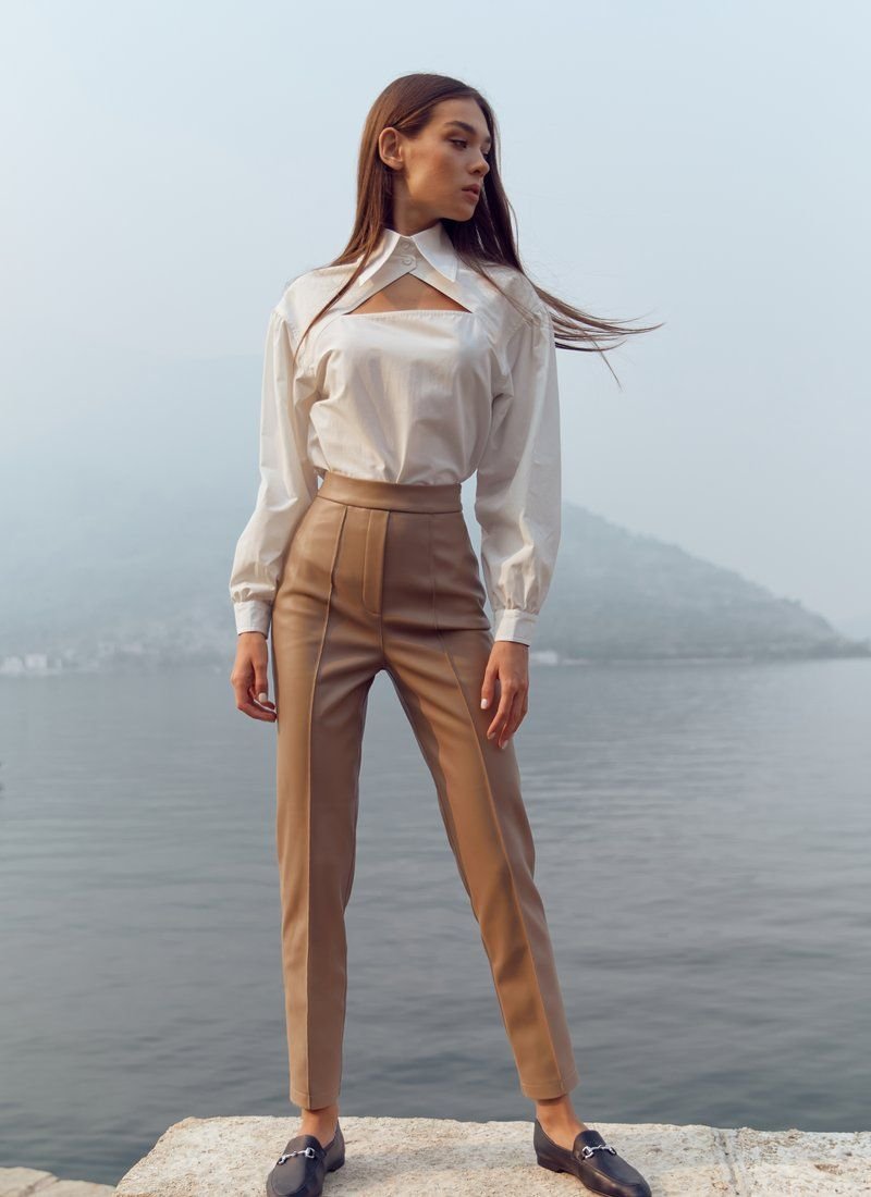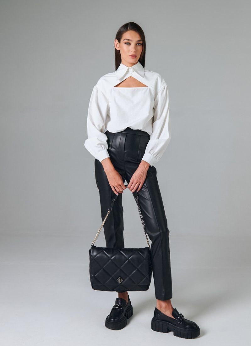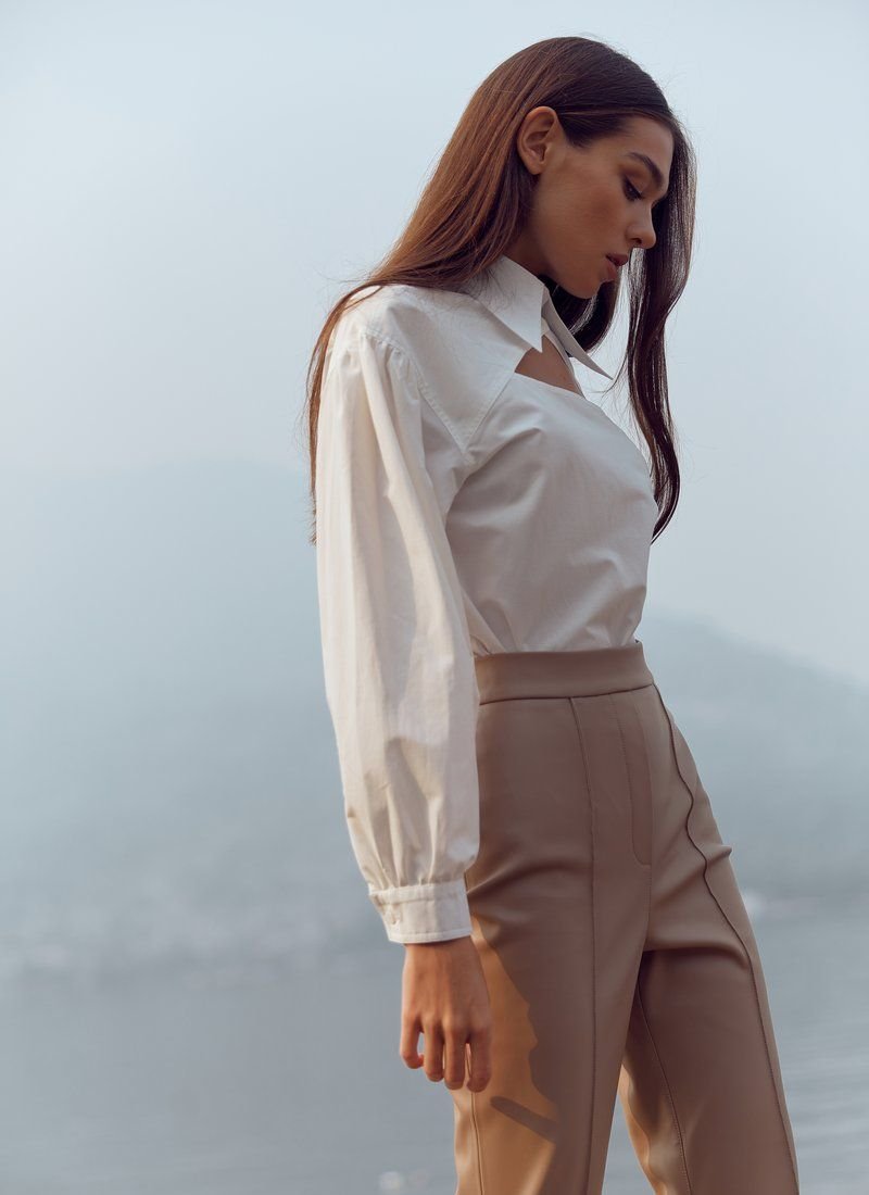 White cotton shirt of the original cut, made of cotton fabric. Gepur designers offer a new reading of the basic shirt! The classic stand-up collar dilutes the curly neckline on the chest. A puffy sleeve with a button closure adds its own zest to the model. The length of the hem makes it possible to wear the shirt tucked and straightened.