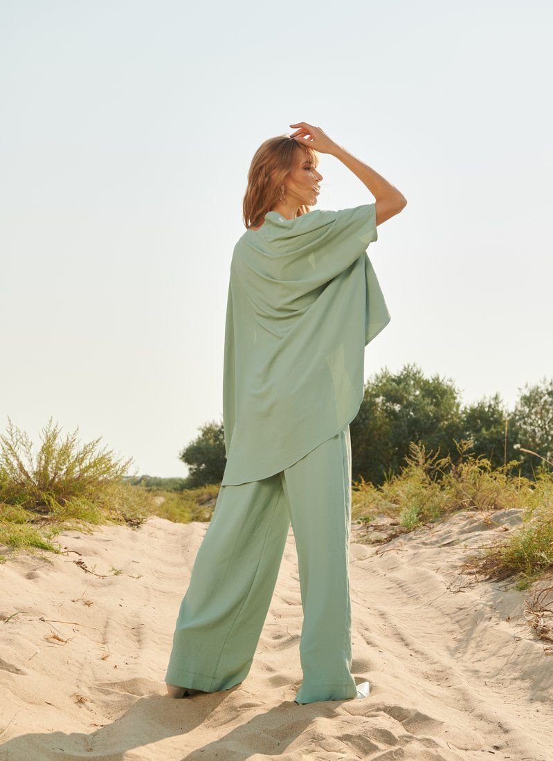 Comfortable casual three-piece set made of soft pressed mint-colored fabric. It includes a crop top with thin straps with an elastic back, flared trousers with a high fit and two pockets on the sides, as well as a loose cardigan with short sleeves.