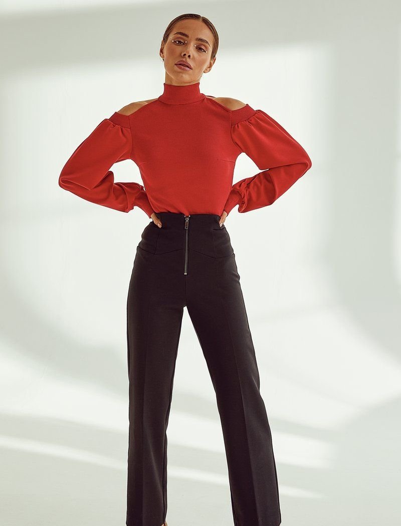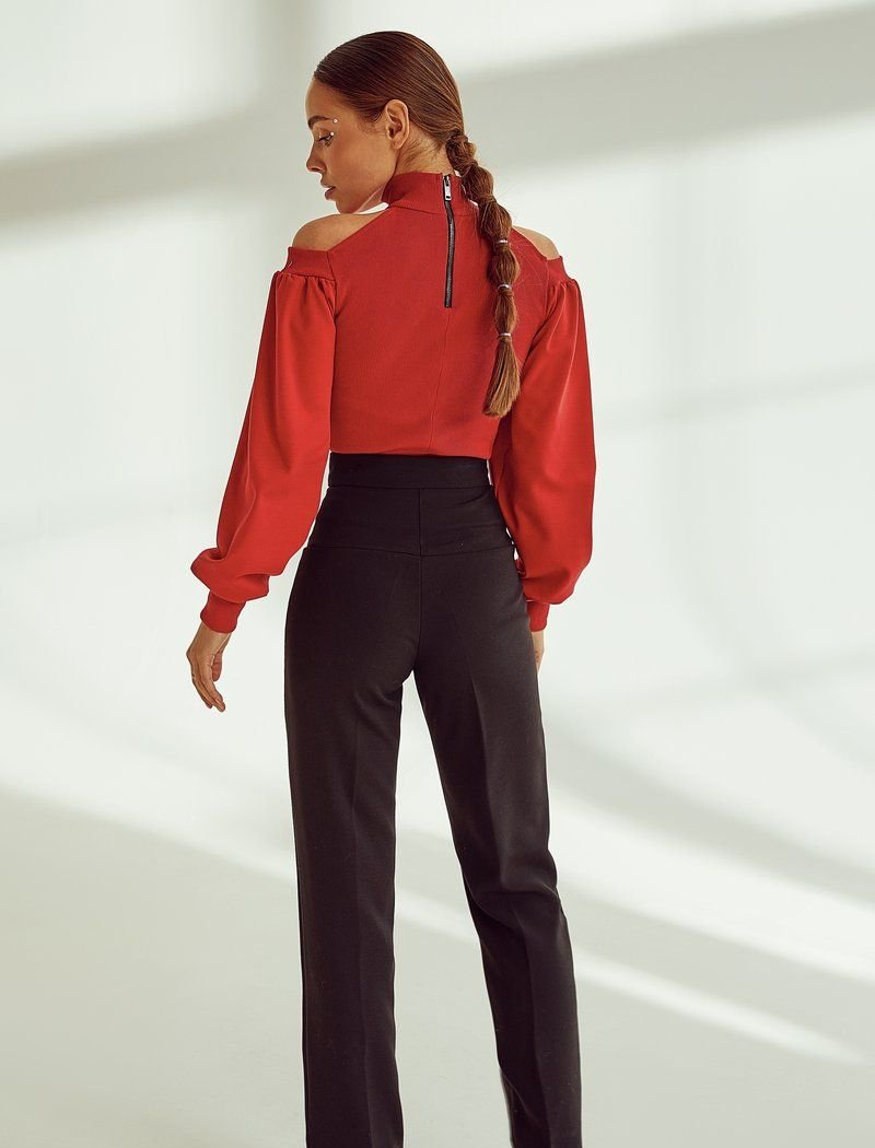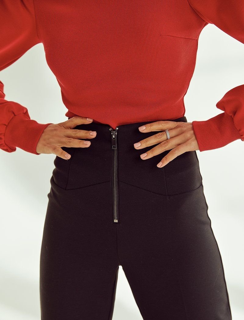 Loose cut with a curly yoke: black trousers turned out to be as comfortable and relaxed as possible. Gepur designers chose a pleasant suit fabric with a silky texture for sewing the model. The front zipper accentuates the waist.