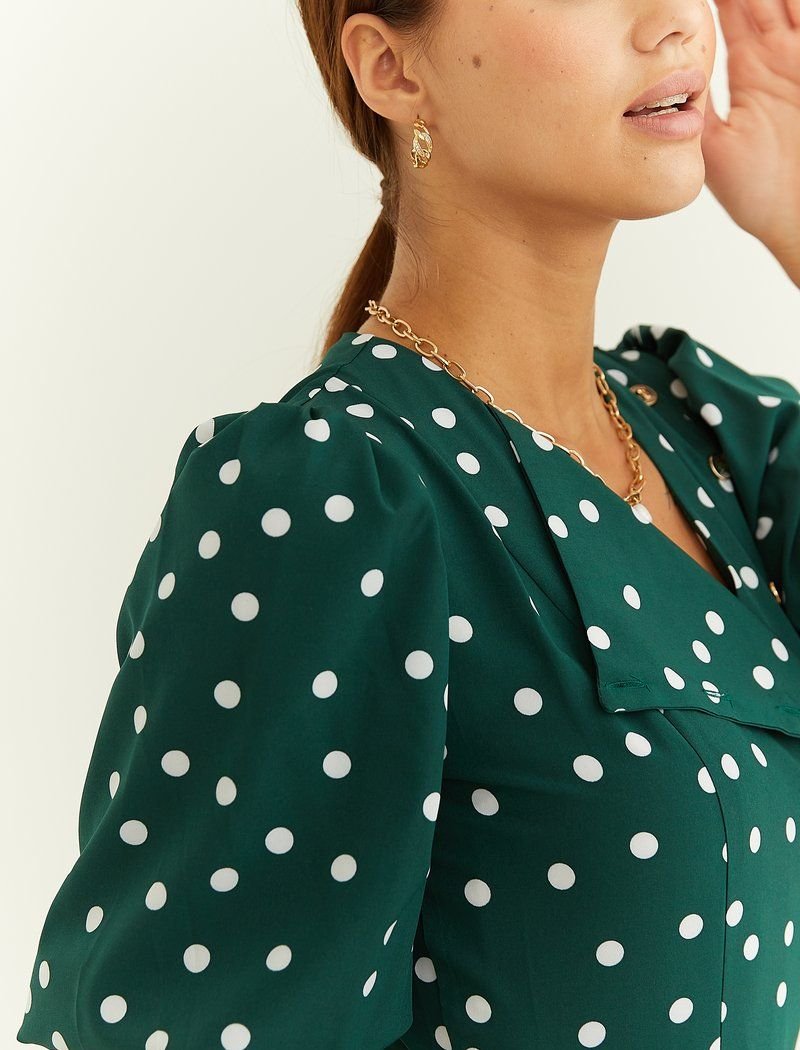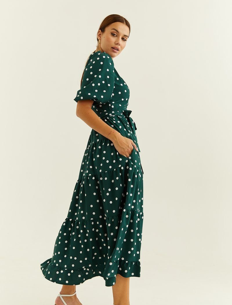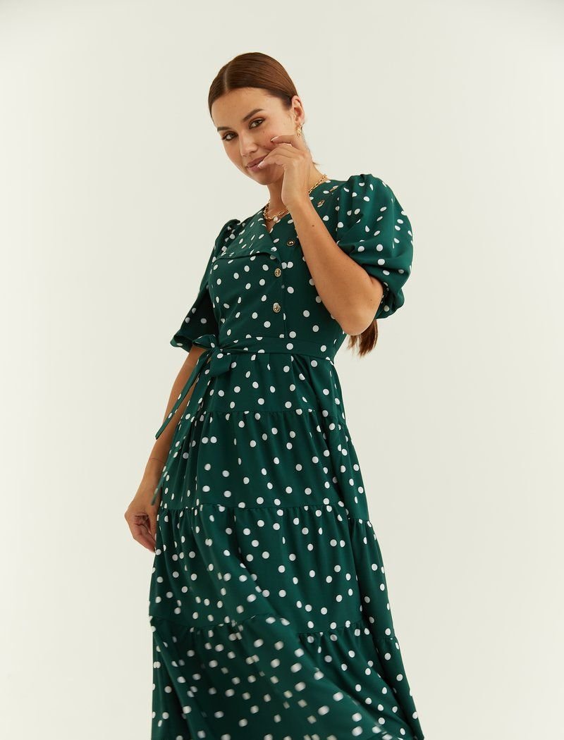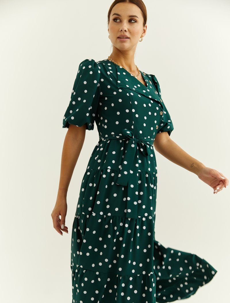A light summer dress made of flowing fabric in pea prints. A multi-tiered midi length skirt with ruffles is one of the most relevant details of this season. A neat short flashlight sleeve with an elastic cuff is complemented by an original yoke with a diagonal button closure. The model provides a long belt-ribbon.