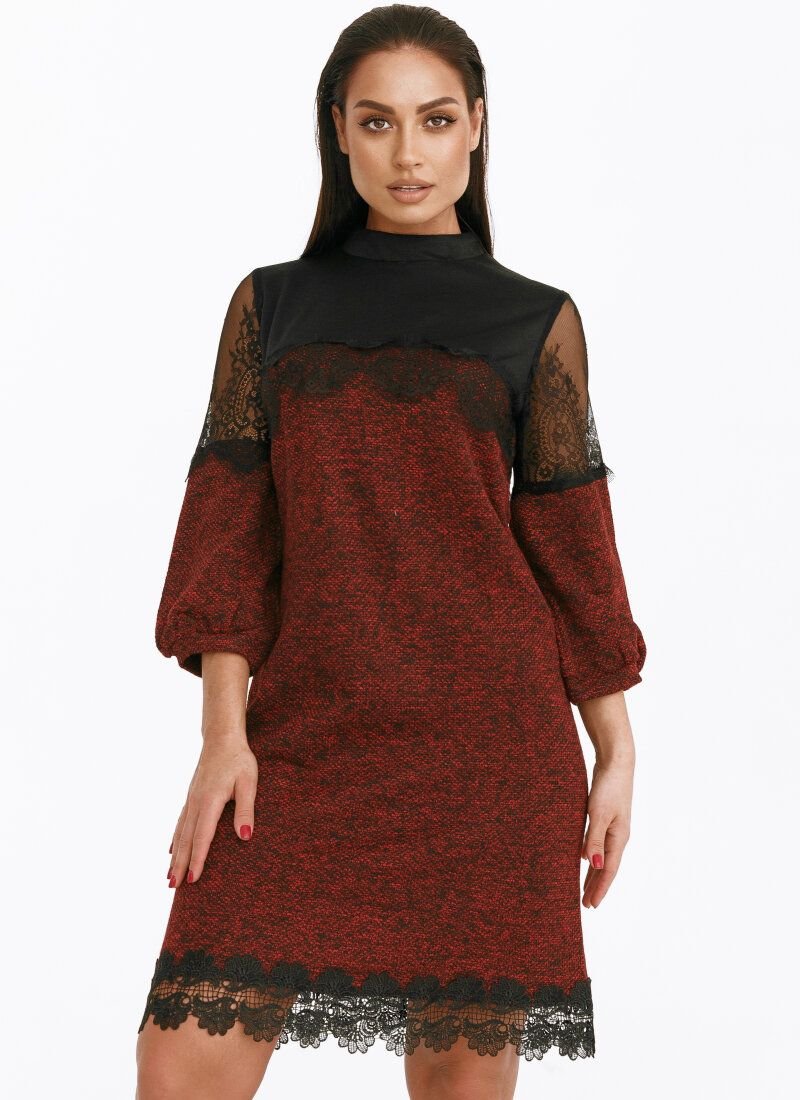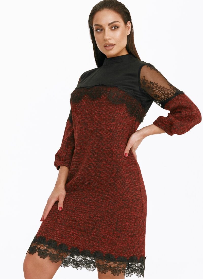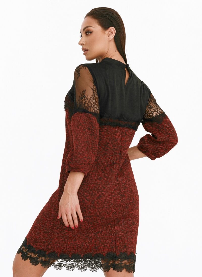 Elegant mini dress with a neat stand-up collar, 7/8-length sleeve with lace inserts, complemented by a removable brooch.