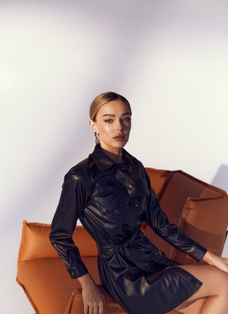 Shirt-cut dresses do not come off the fashion catwalks: they could be found at the shows of Celine and Chloé FW'20/21. The universal black model is complemented by a button closure, chest patch pockets and a turn-down collar. A wide belt made of textured eco-leather in the set emphasizes the waist.