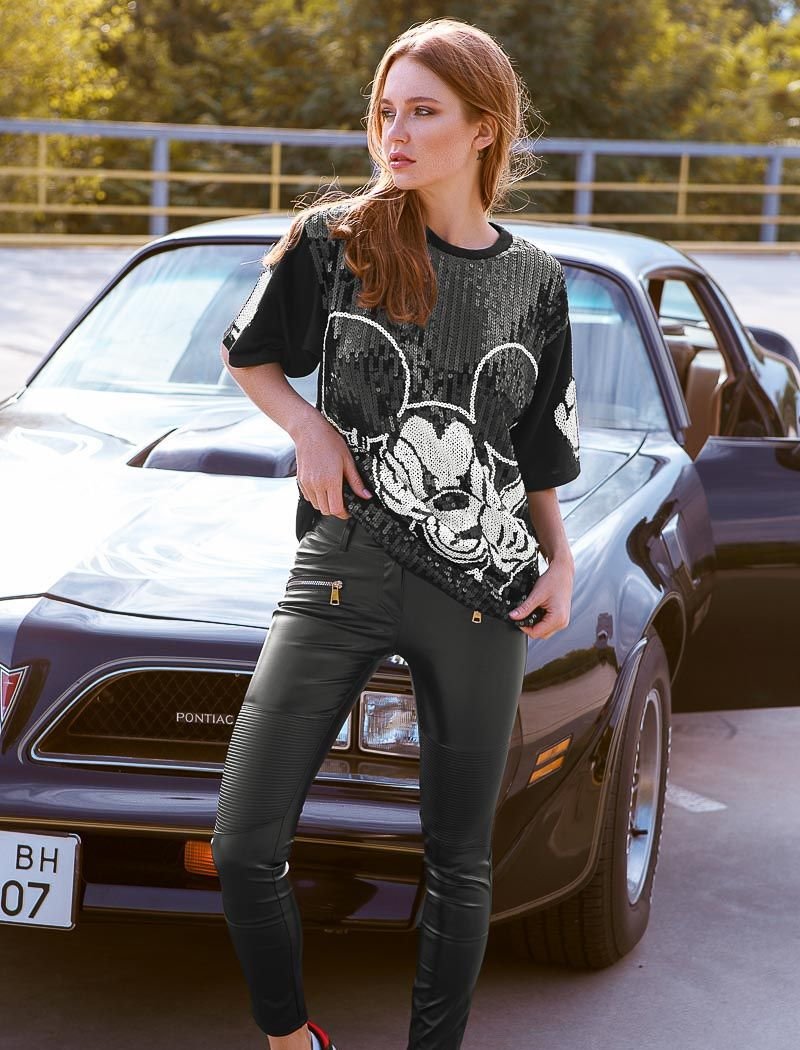 Current leggings of medium fit, made of soft eco-leather on a knitted basis: a sewn belt with loops, zippered pockets and inserts on the knees made of quilted textile with dusting.