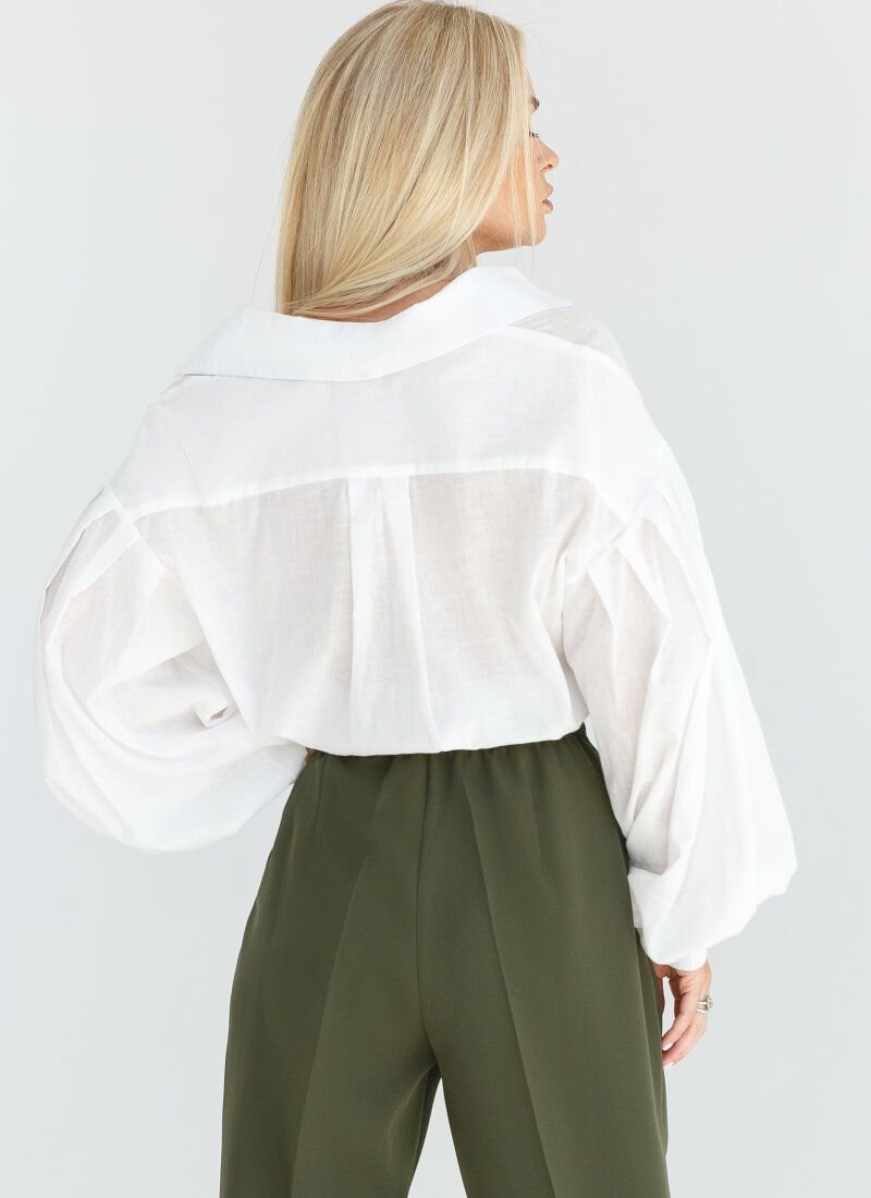 This lightweight shirt is not devoid of femininity, despite the loose fit. The turn-down collar is complemented by a button placket along the entire length. The volume of the sleeves is created by wide pinches on the shoulder line and cuffs. Small incisions are made on the side seams, which round the hem.
