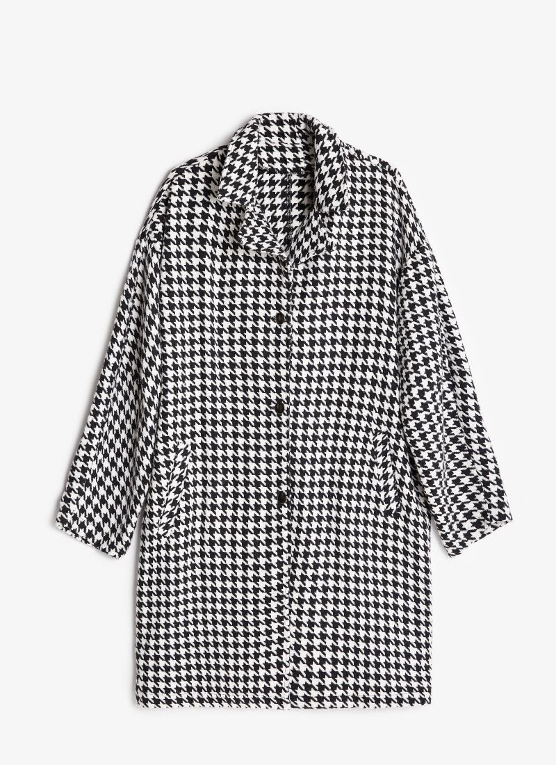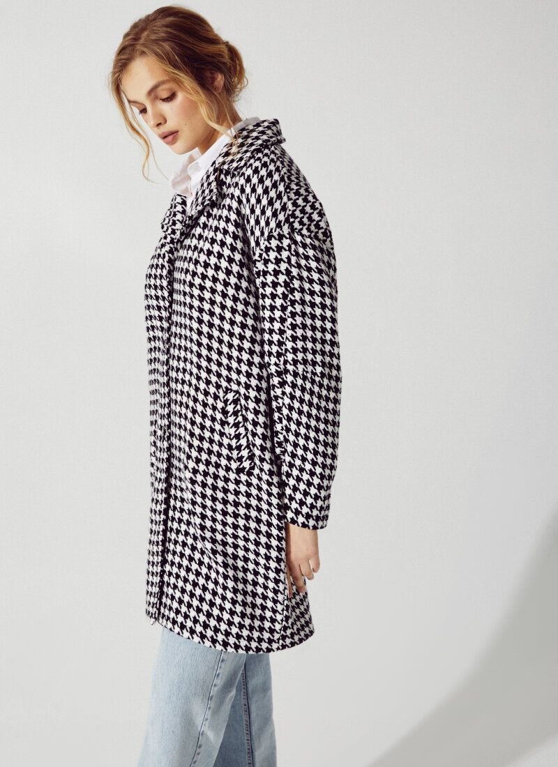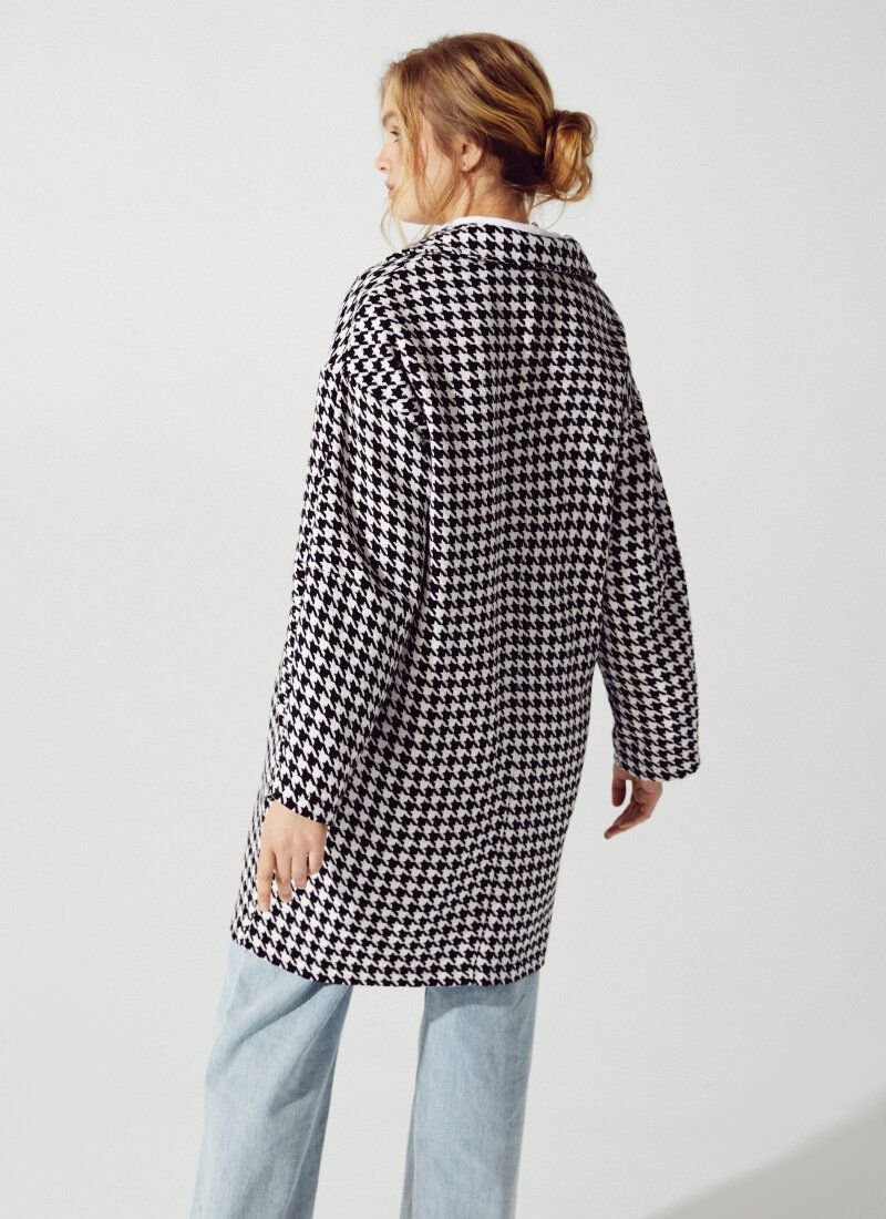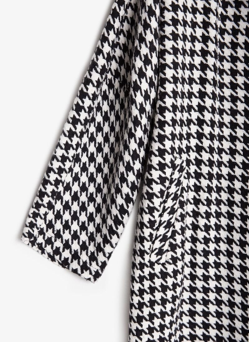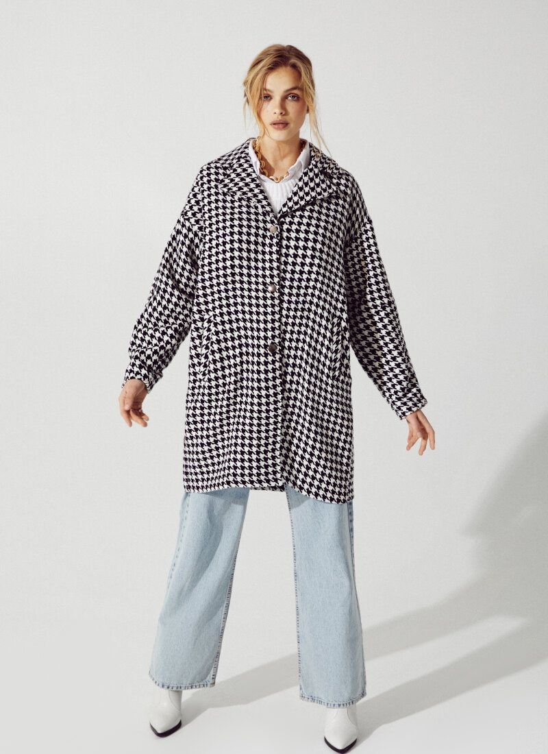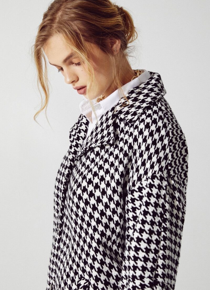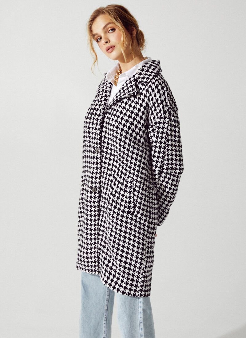 The black and white coat is made of thick tweed material. The model with a turn-down collar with lapels is decorated with a "crow's foot" print, which became a trend at the shows of FW'20/21 Versace and Off-White.