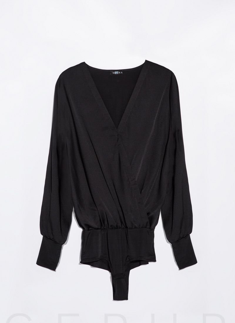 An elegant body blouse made of silk: a bodice with a fixed smell (button), a loose sleeve with a wide cuff and an elastic insert at the waist.