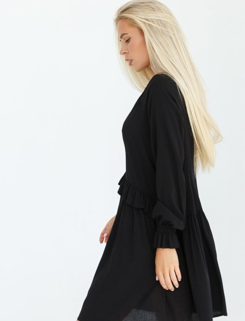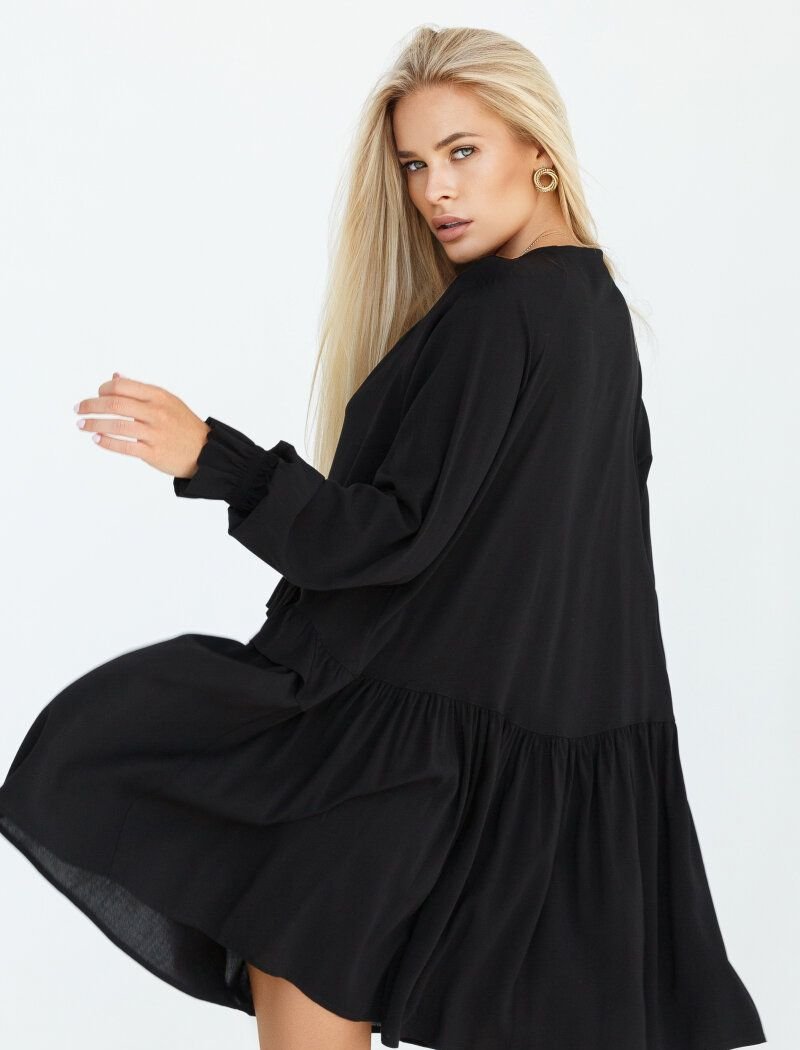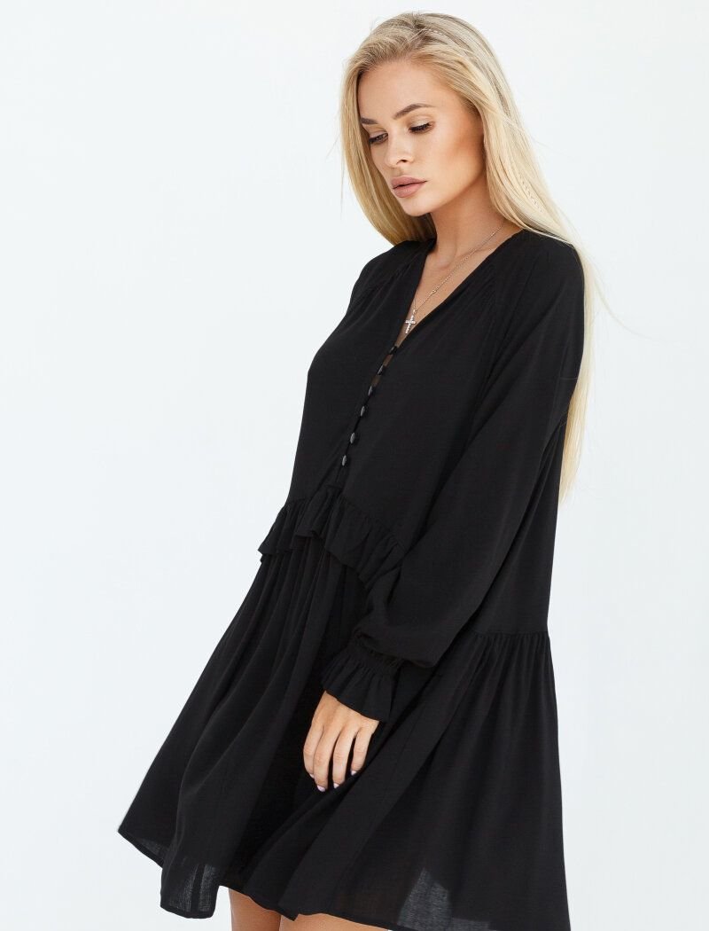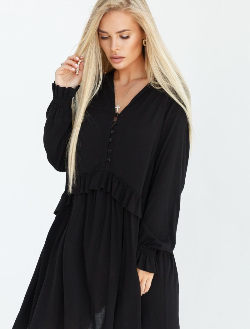 This light dress is not devoid of coquetry, despite the strict black color. The deep v-shaped neckline is complemented by a button placket to the waistline. The volume of the sleeves is created by elastic cuffs with flounces. The asymmetric flared skirt in a pleat is decorated with a frill at the cut-off waist.
