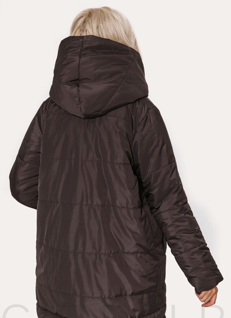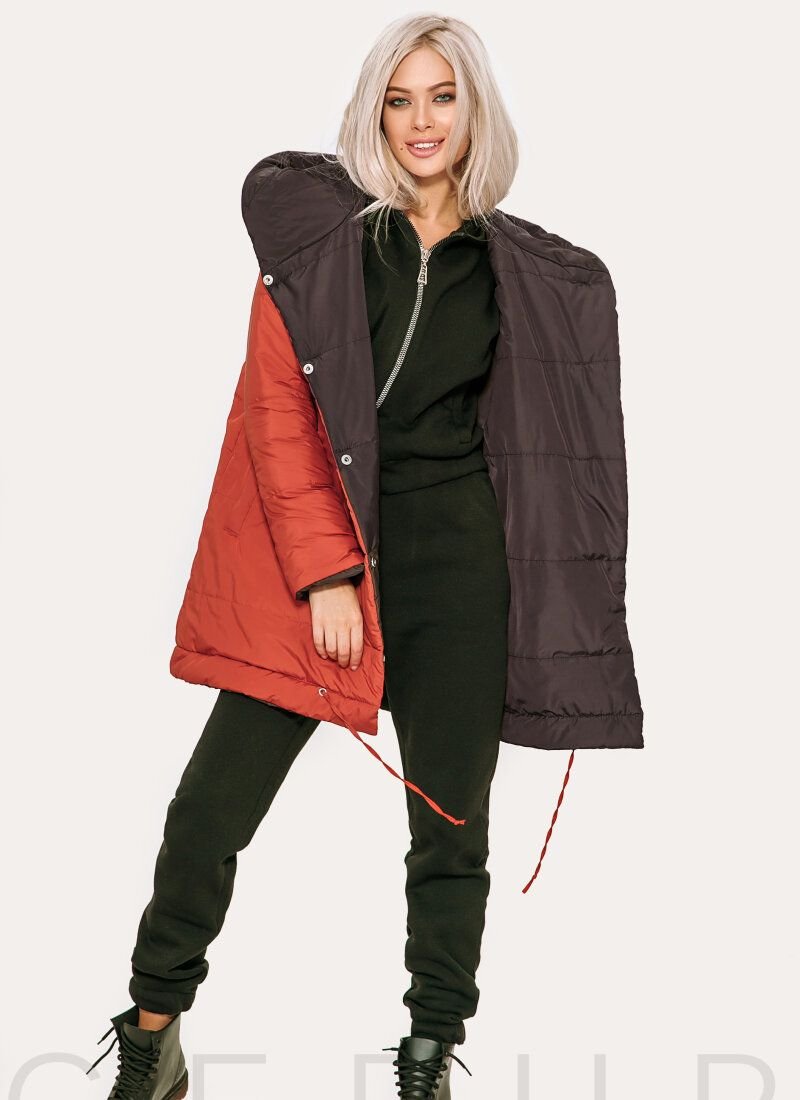 A two-sided voluminous jacket in a trendy color: a non-detachable hood, a long sleeve, a strap with metal buttons in the front and a drawstring hem.Features: additional insulation - sintepon (200 g /m2). Please note that the product is designed for temperatures up to -10 °C.