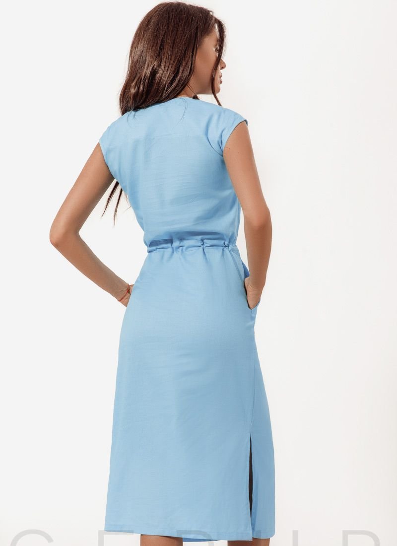 Casual dress of classic cut without sleeves, round neck, ties at the waist, rounded hem with slits on the sides and two pockets, patch with a flap on the chest and cut-off on the skirt.